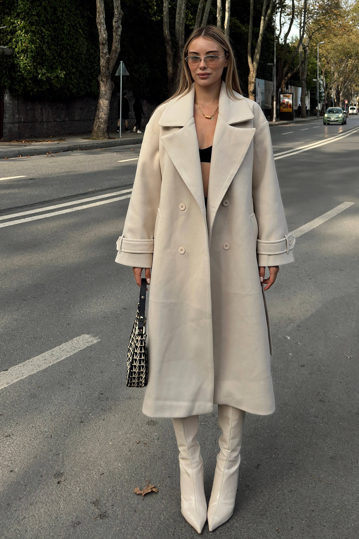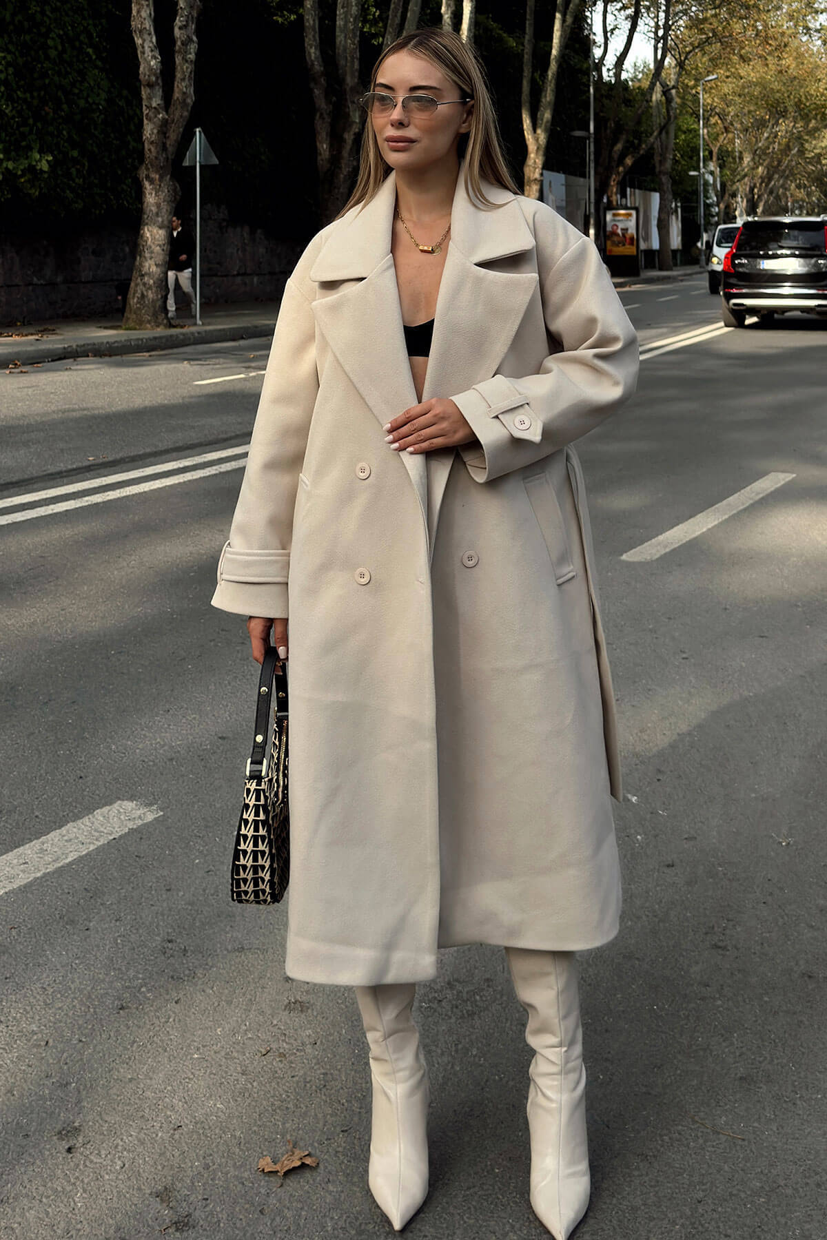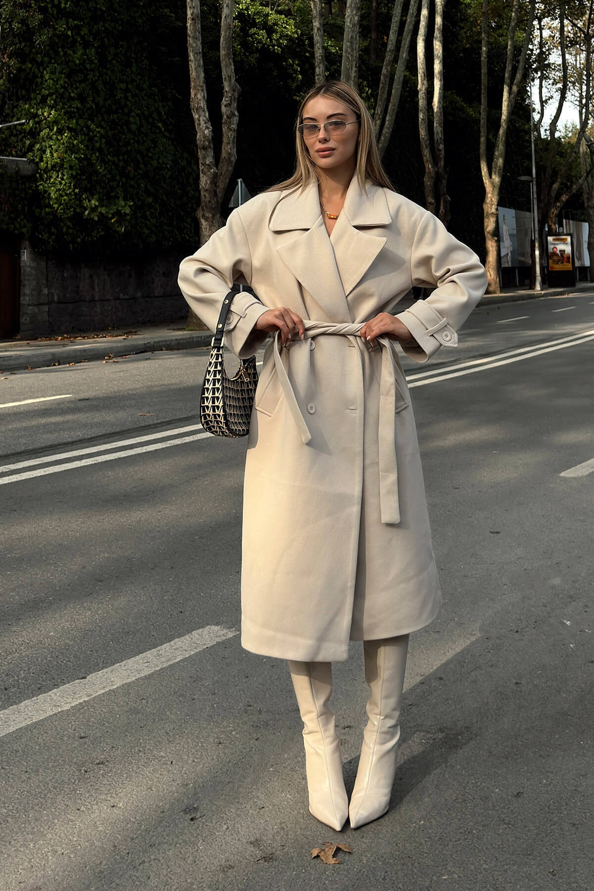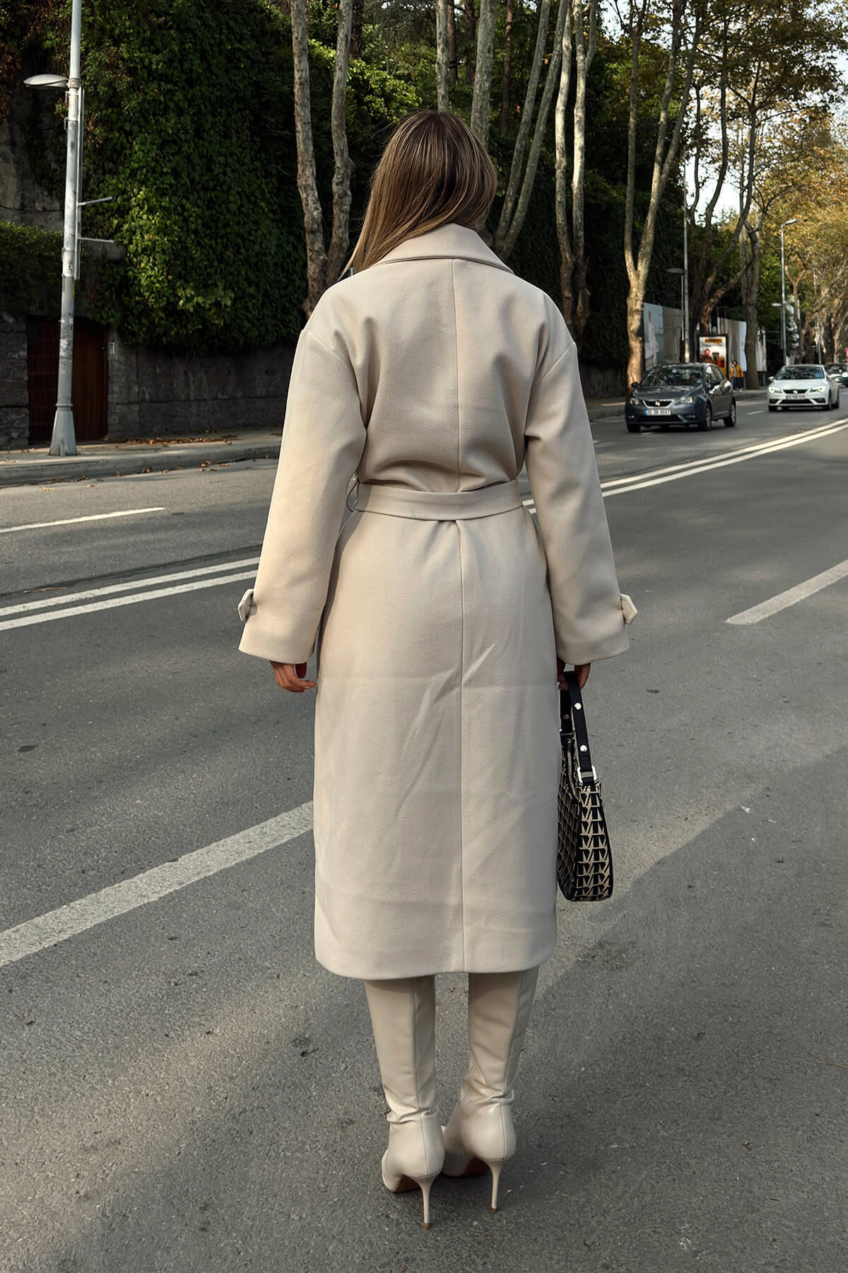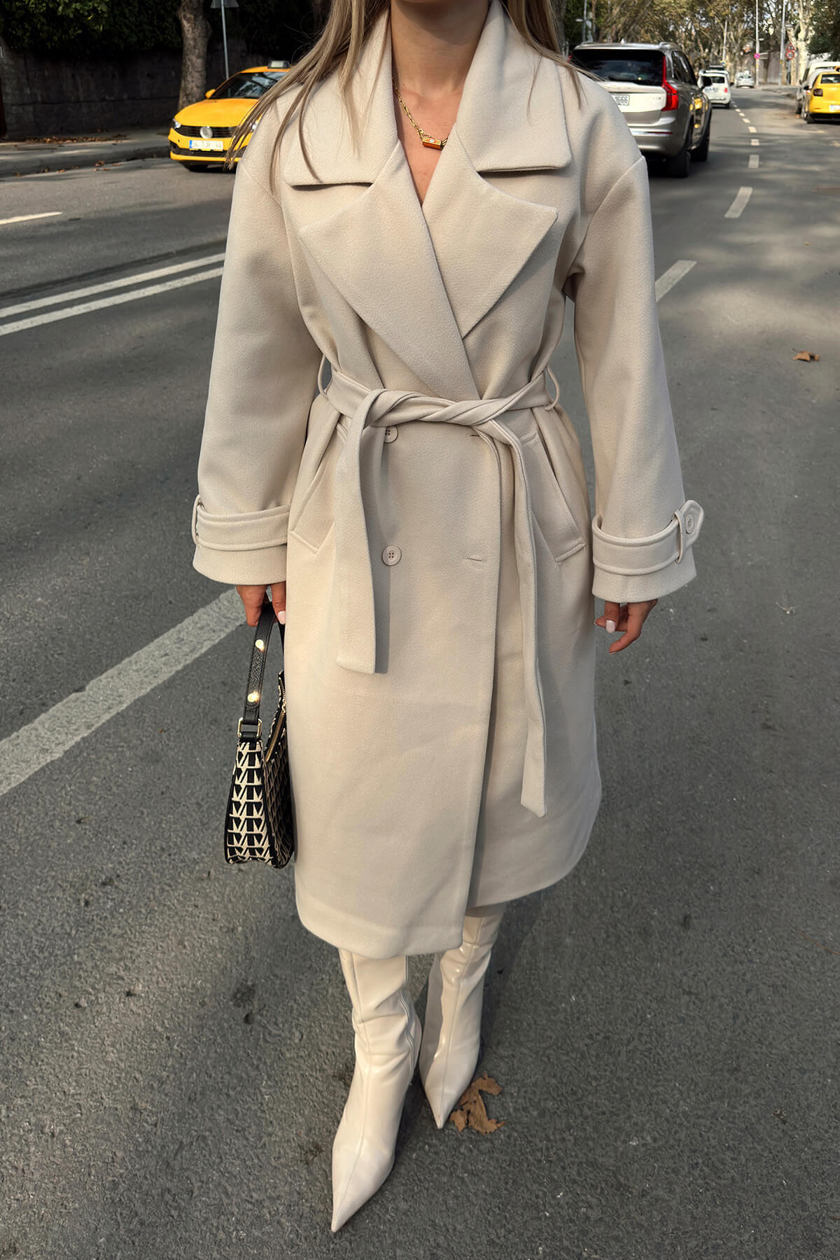 Bej Kruvaze Kol Manşetli Kuşaklı Astarlı Uzun Kadın Midi Kaşe Kaban