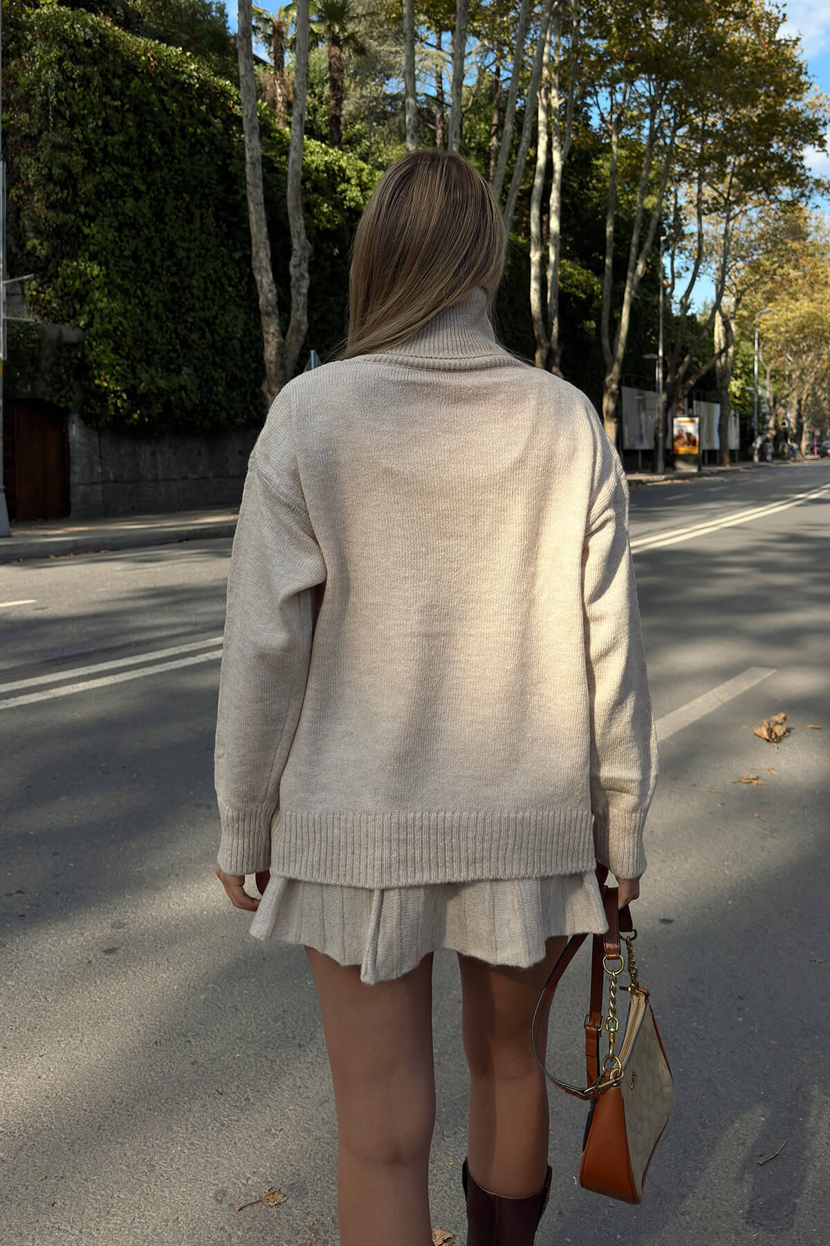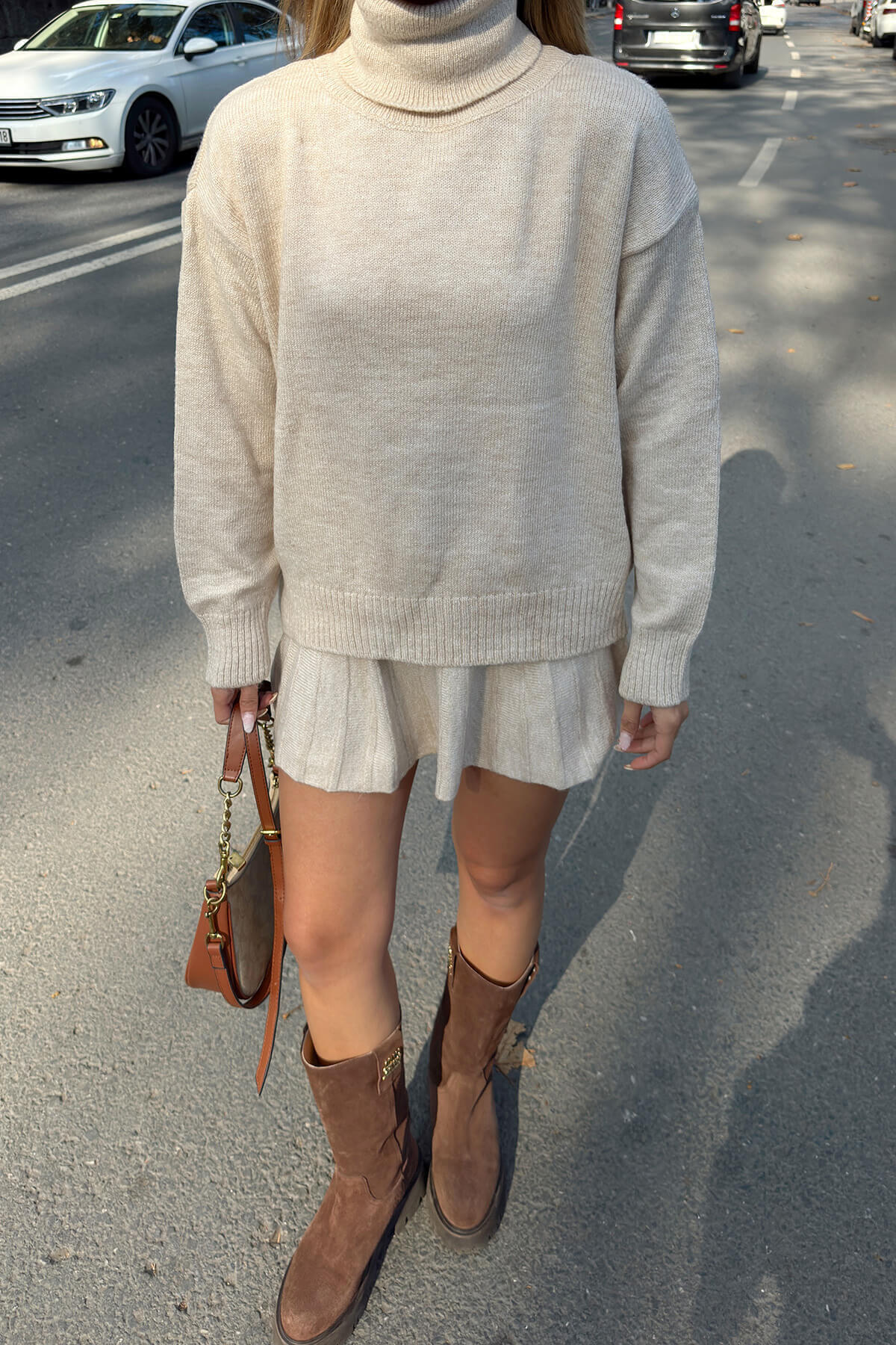 Bej Raina Balıkçı Yaka Kazak-Pilise Etekli Kadın Triko Alt Üst Takım