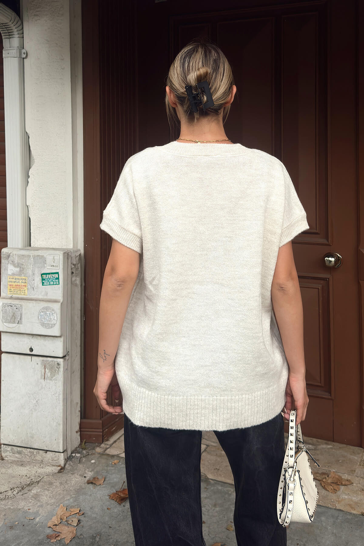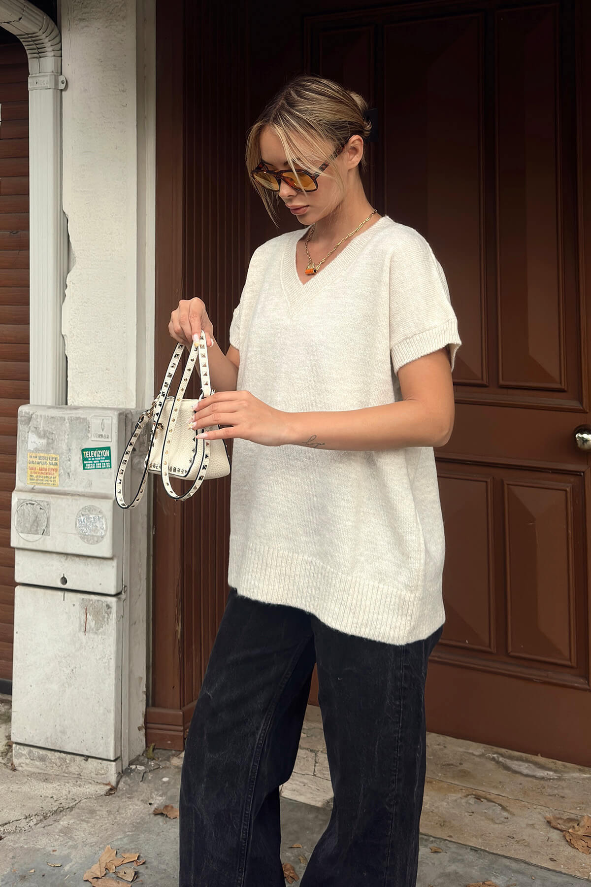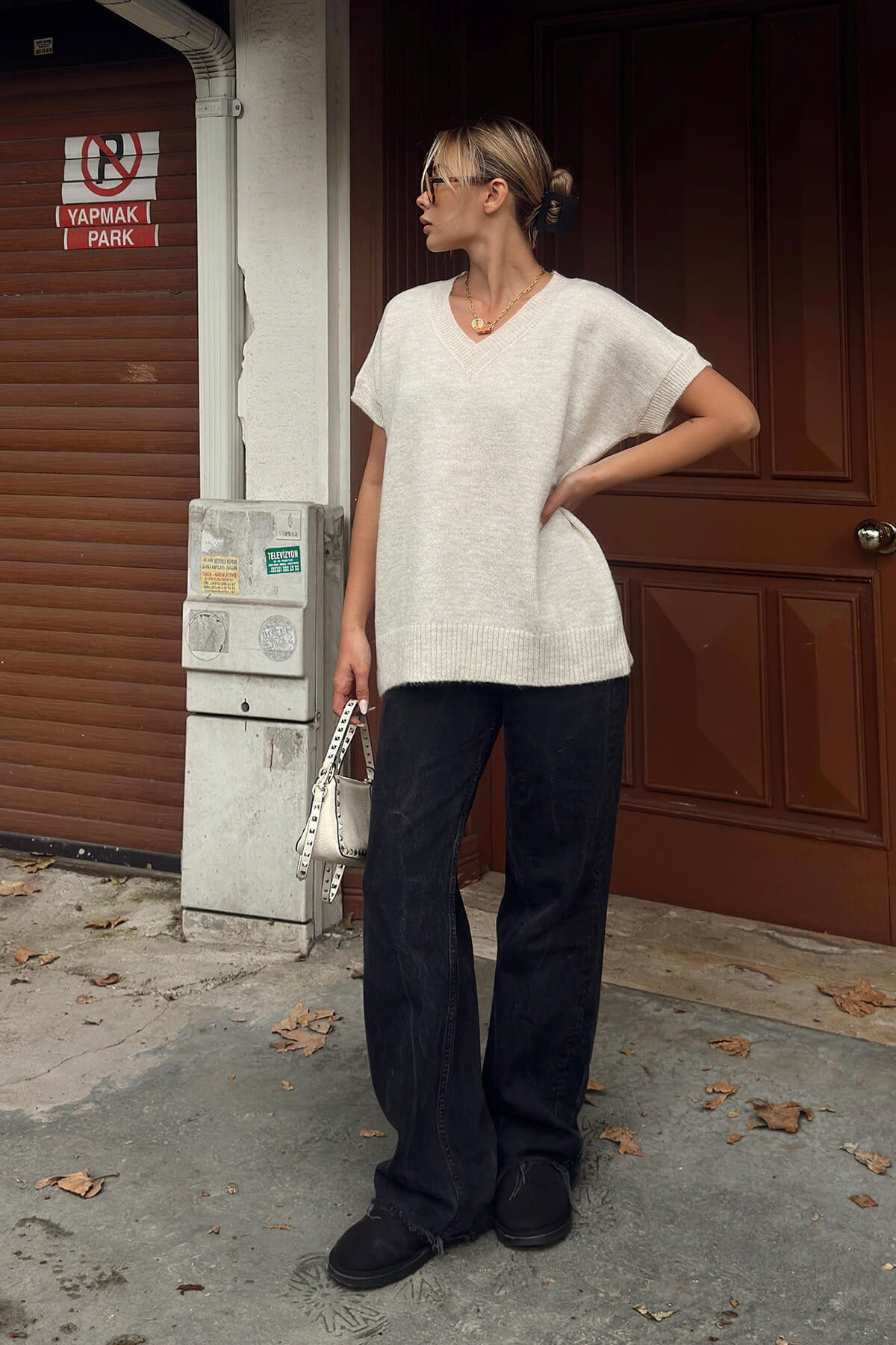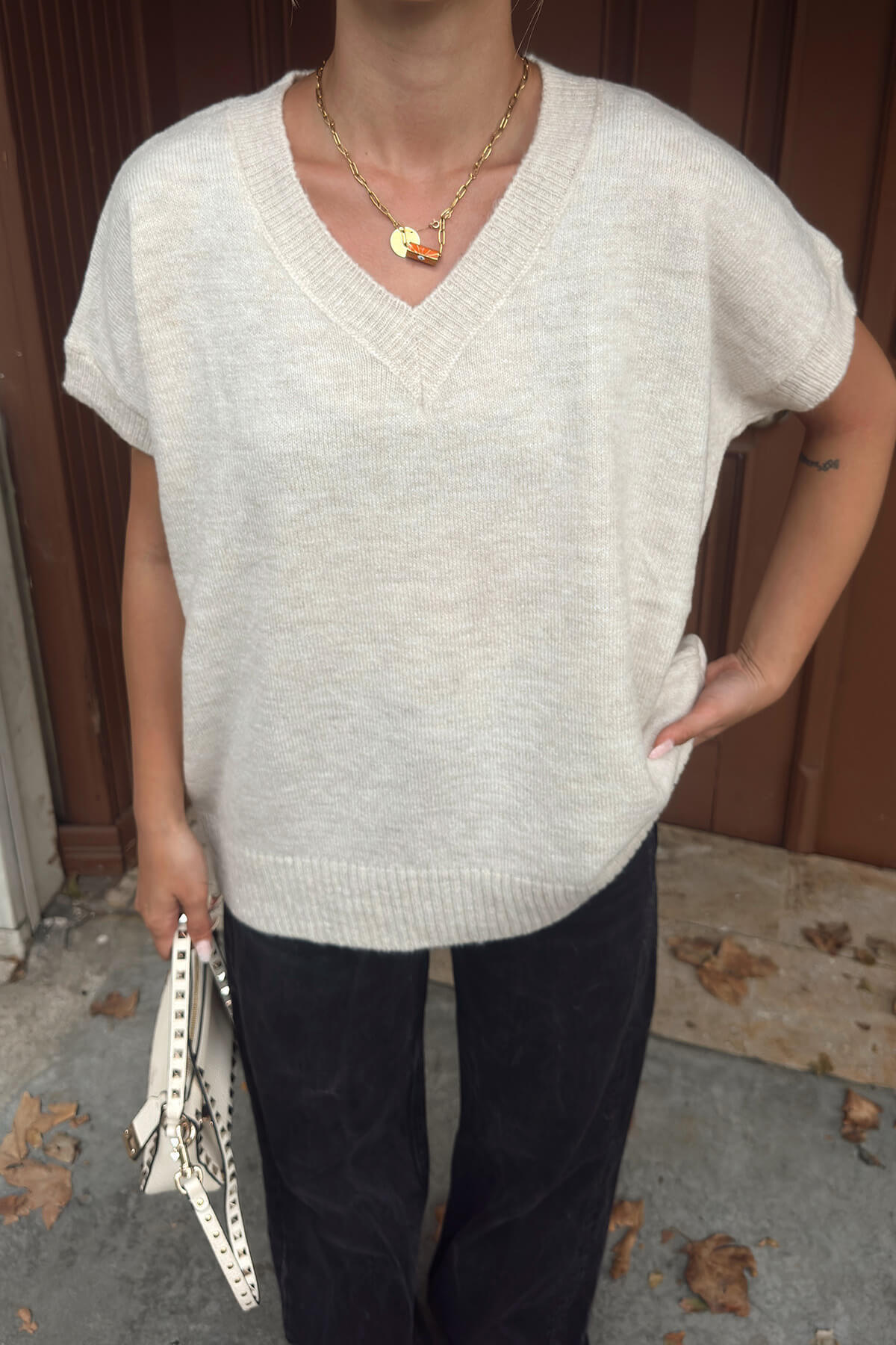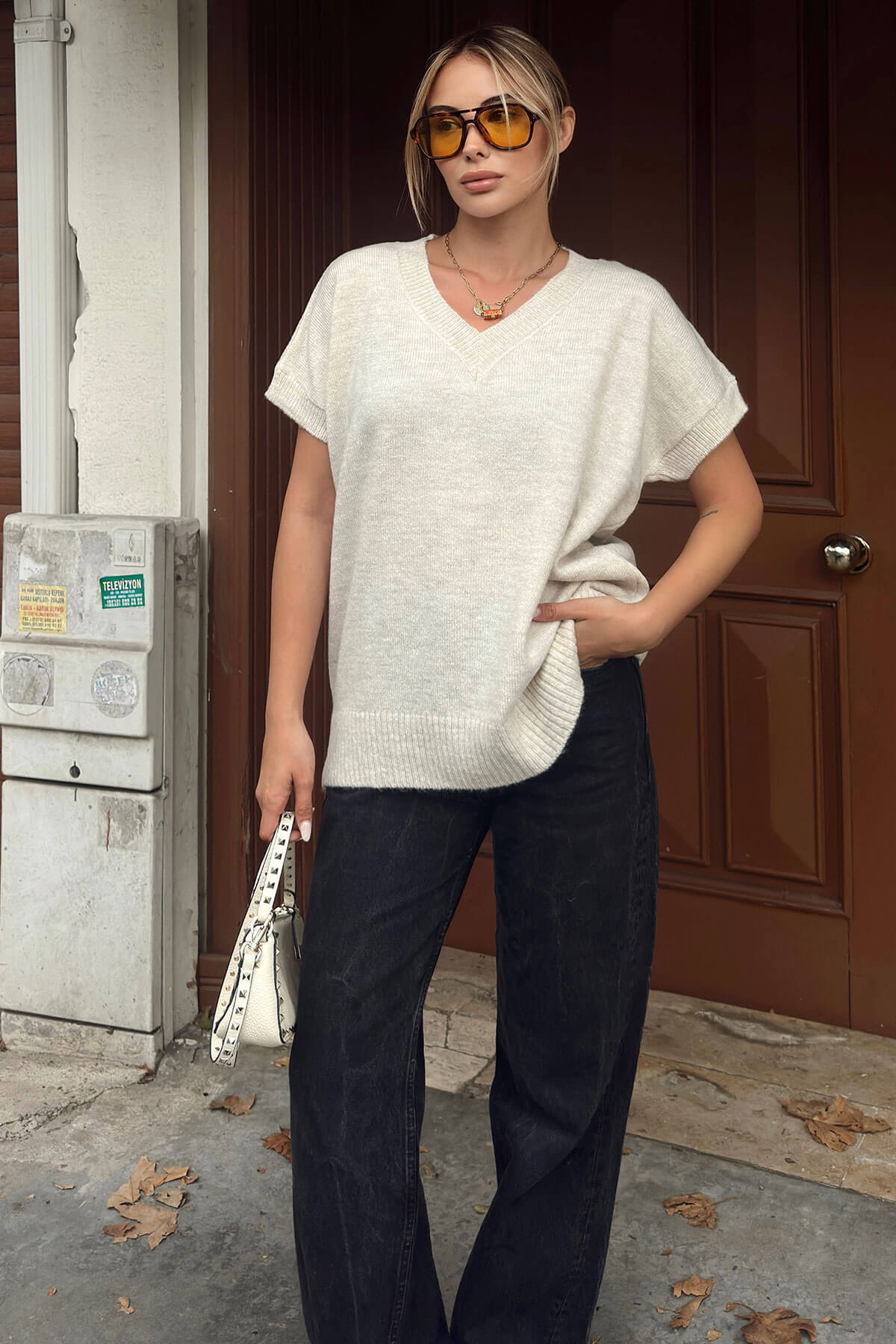 Bej V Yaka Düşük Kol Kadın Triko Süveter