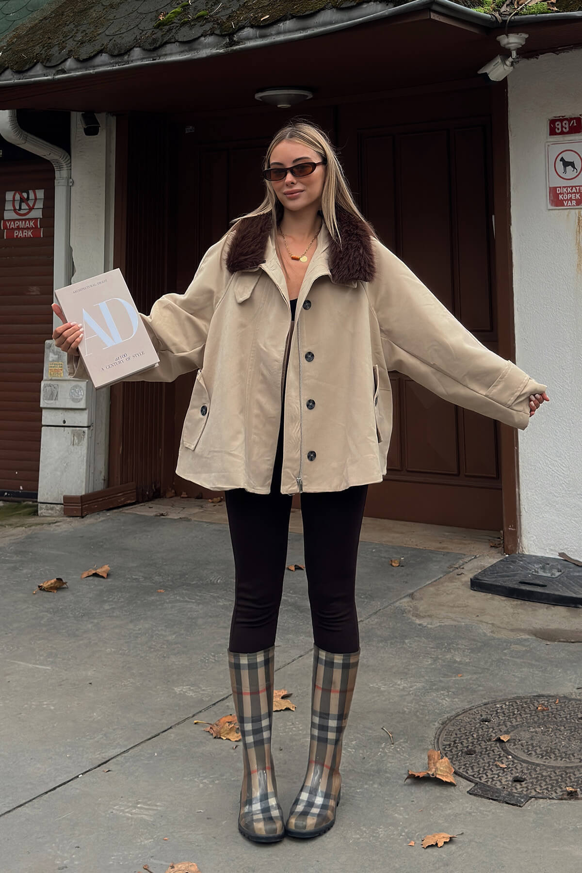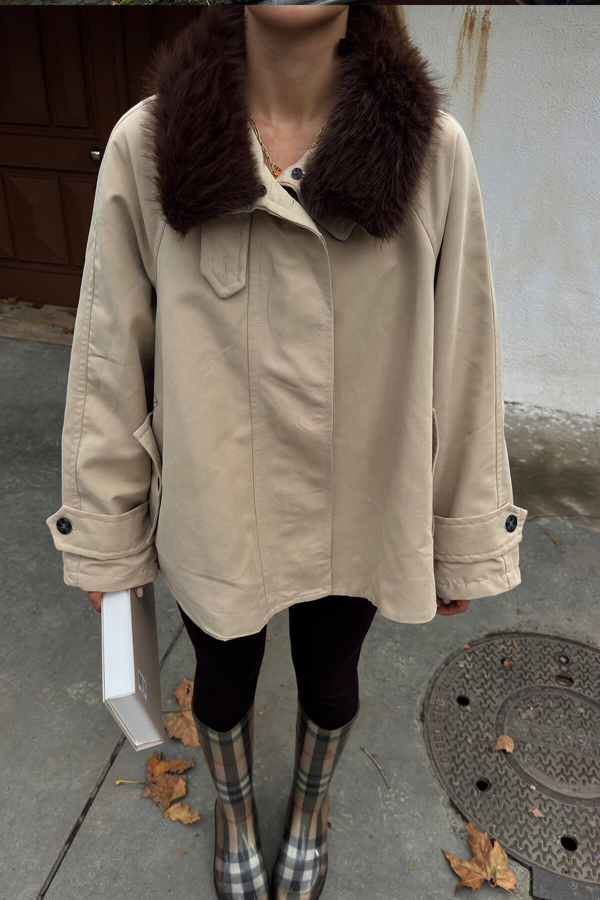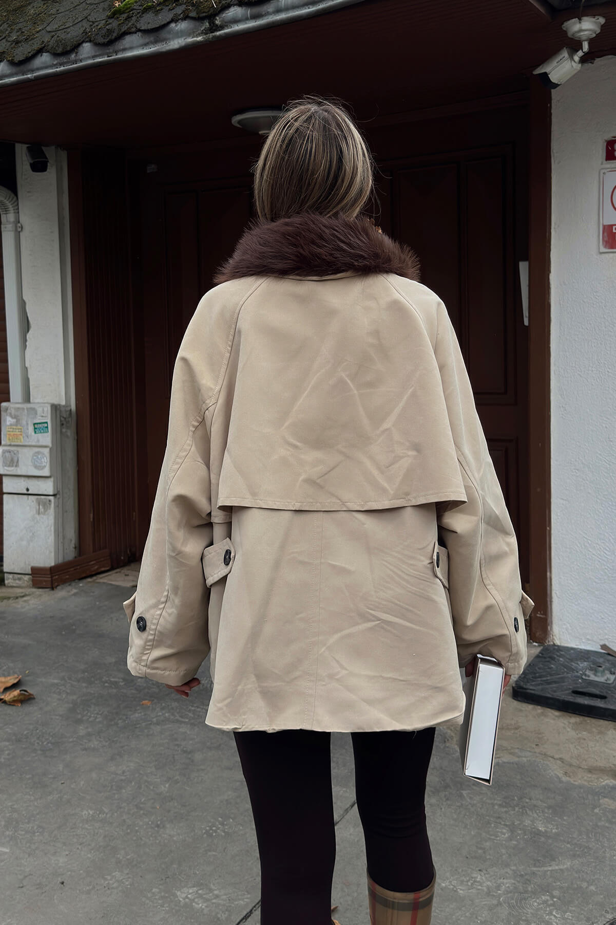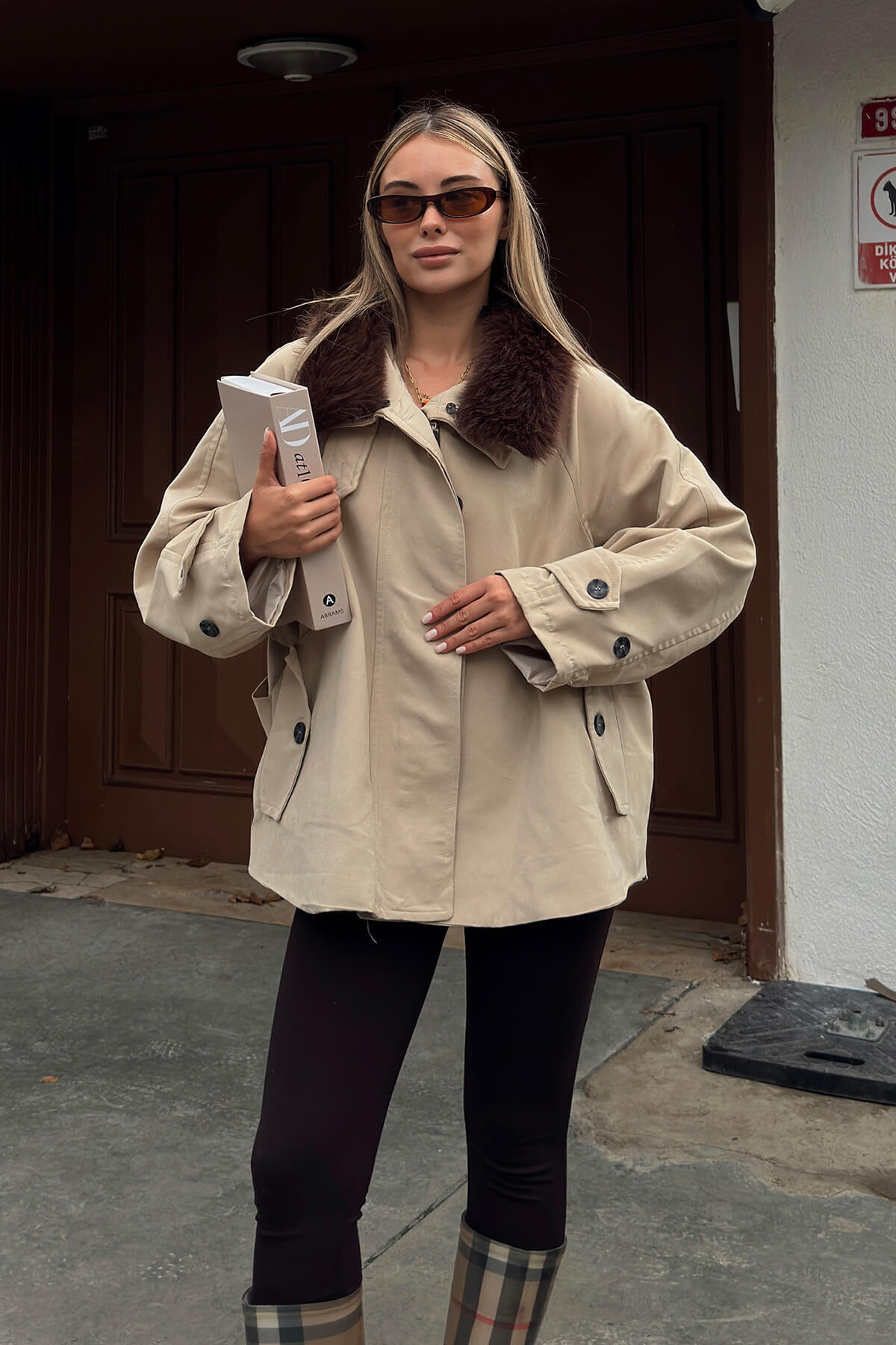 Bej Yakası Kürklü Manşet Ve Cep Detaylı Oversize Kadın Mont