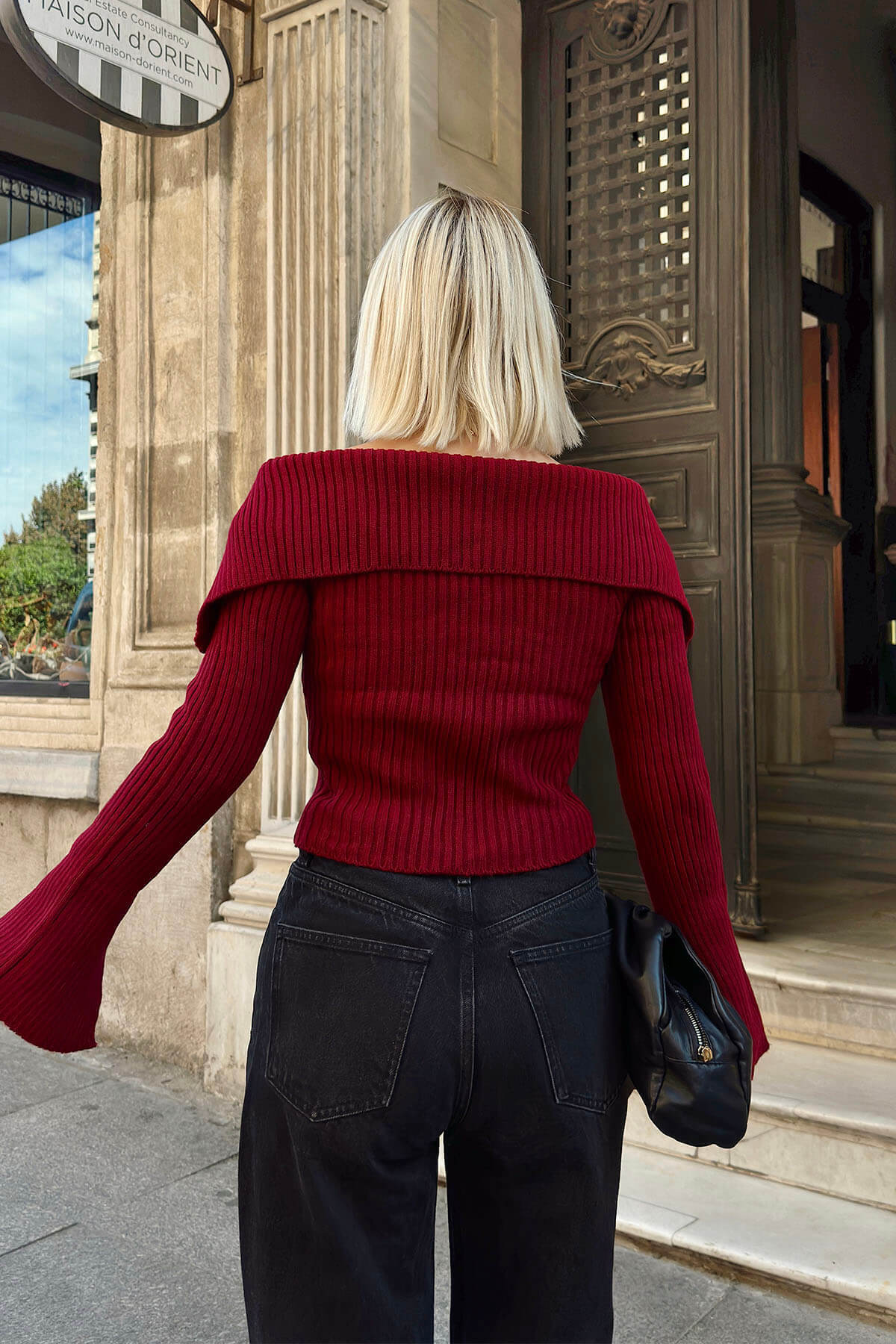 Bordo İspanyol Kol Degaje Yaka Fermurlı Örme Kadın Triko Crop Kazak