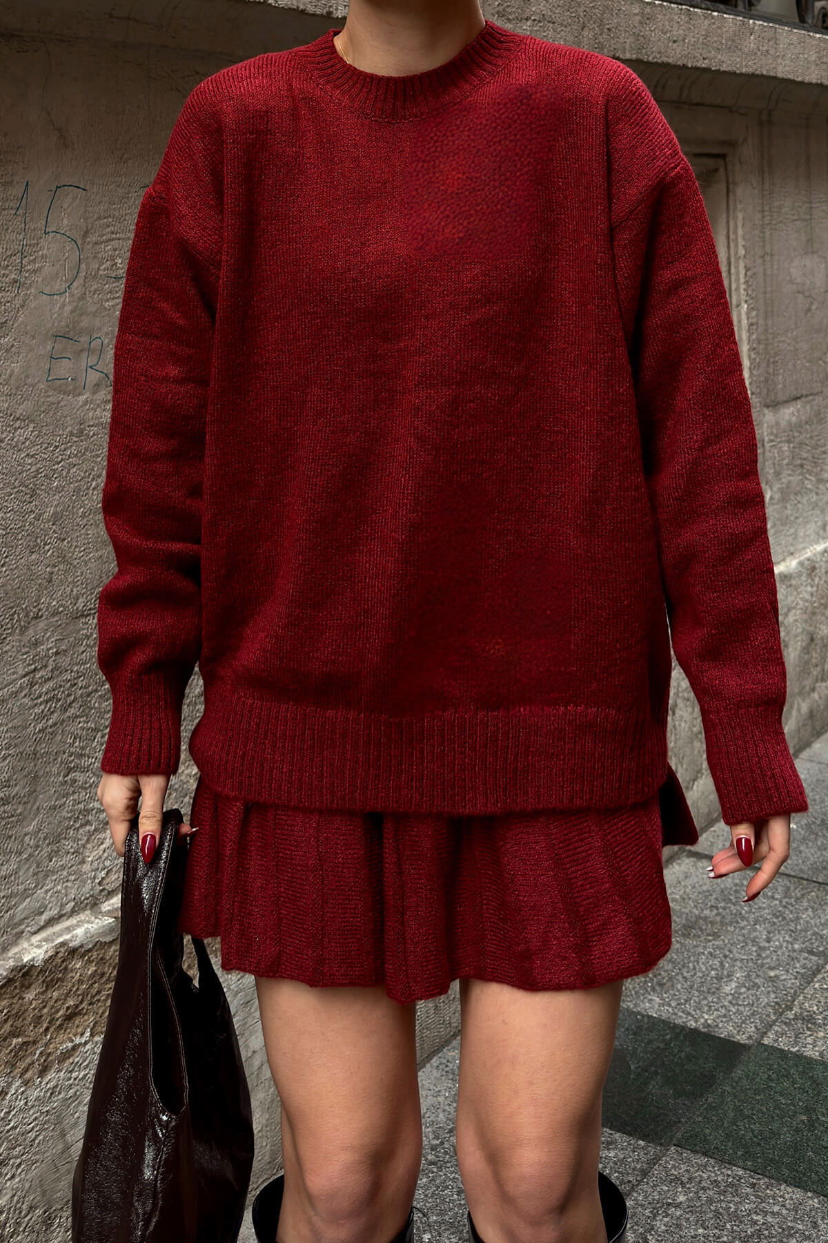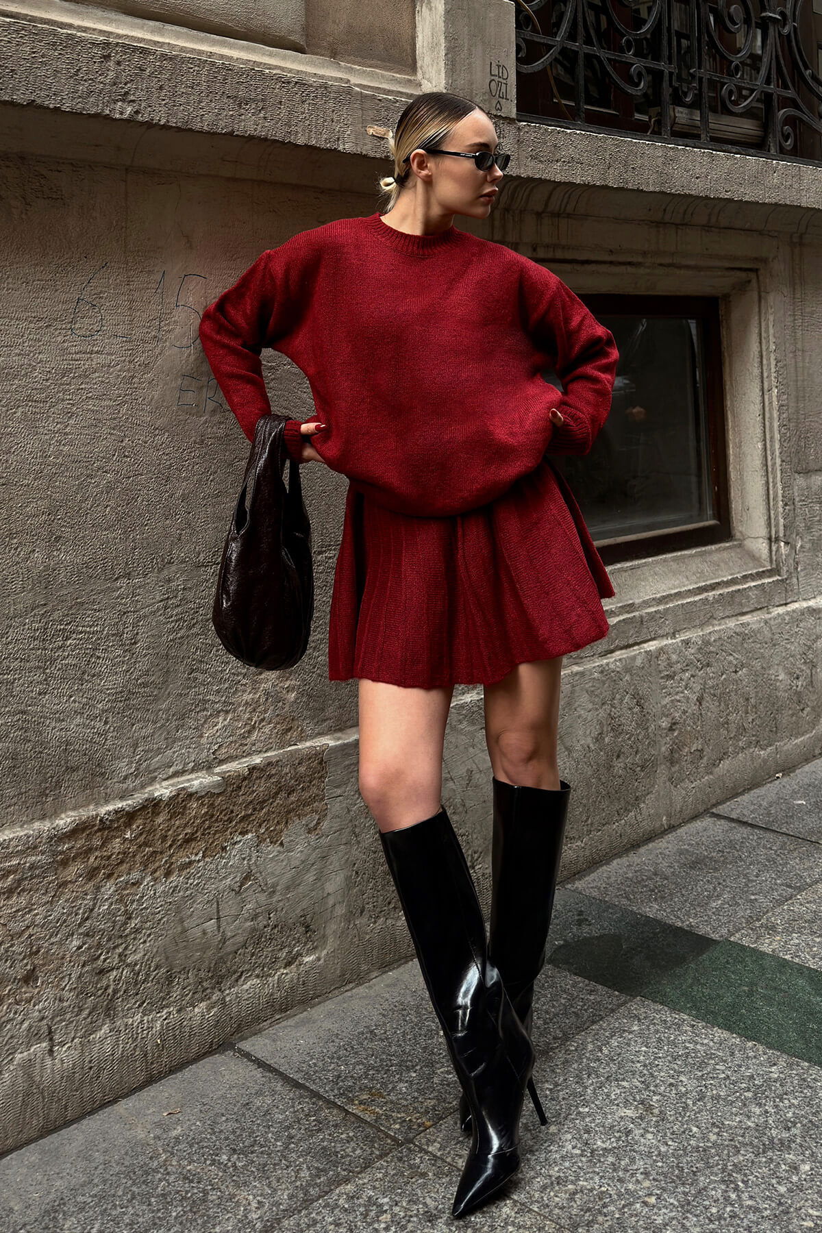 Bordo Paloma Piliseli Etek-Bisiklet Yaka Kazak Kadın Triko Alt Üst Takım
