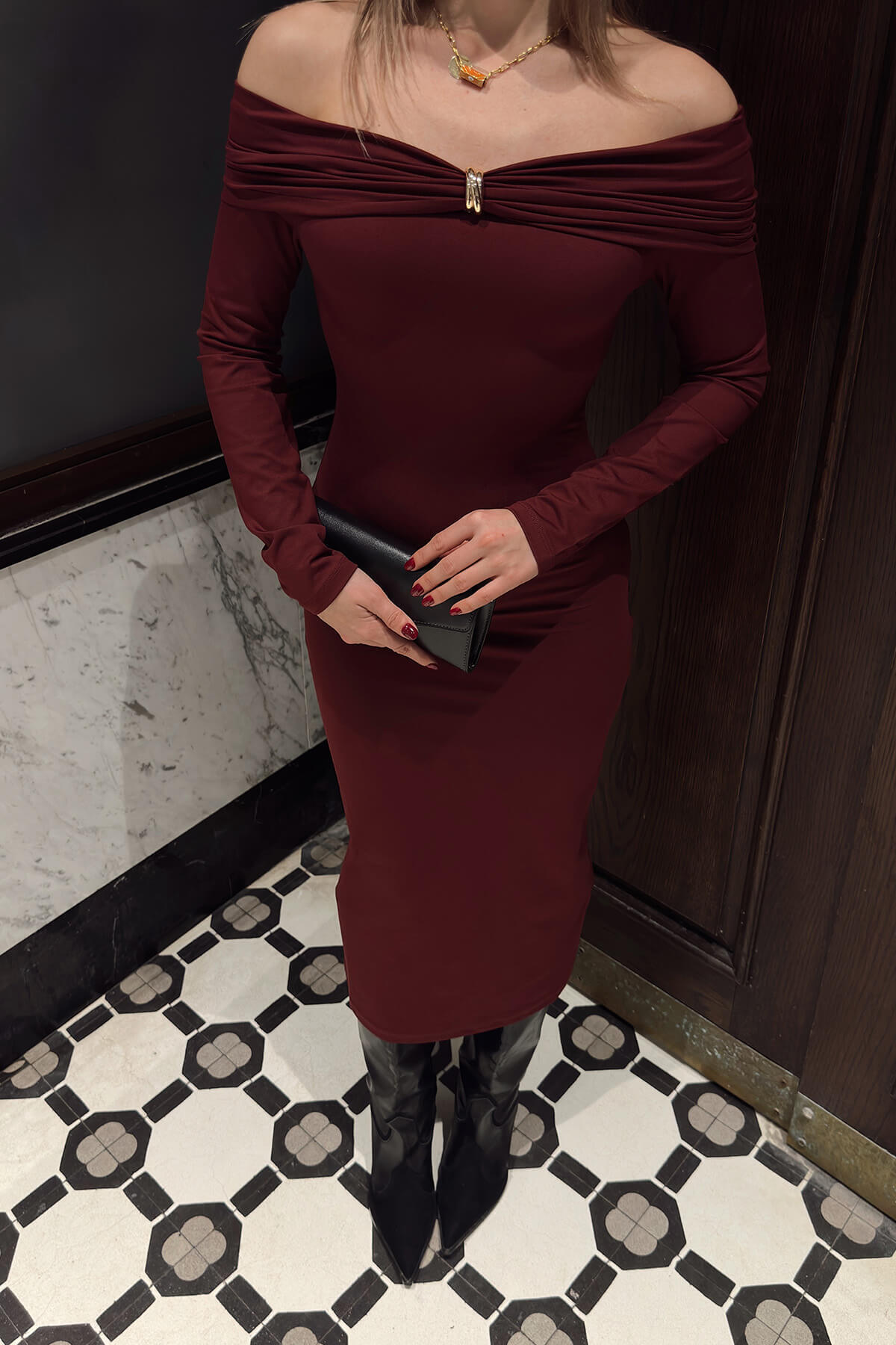 Bordo Toka Detaylı Madonna Yaka Uzun Kollu Kadın Sandy Midi Elbise