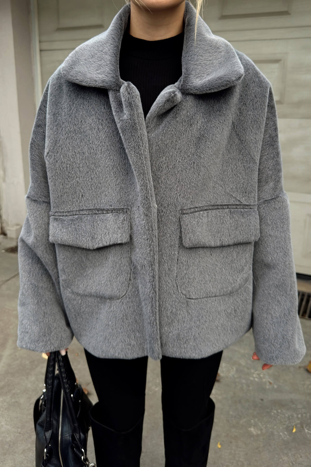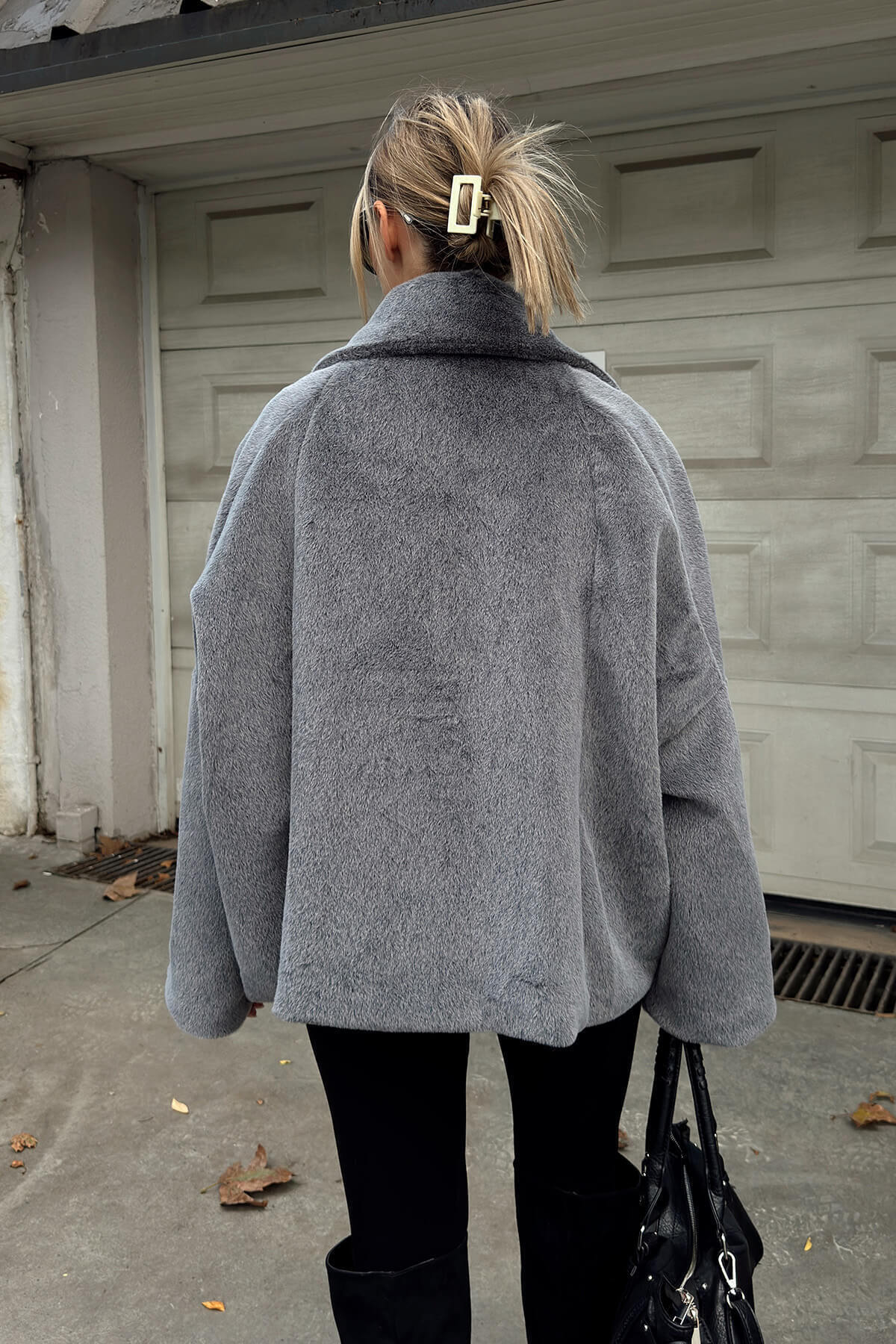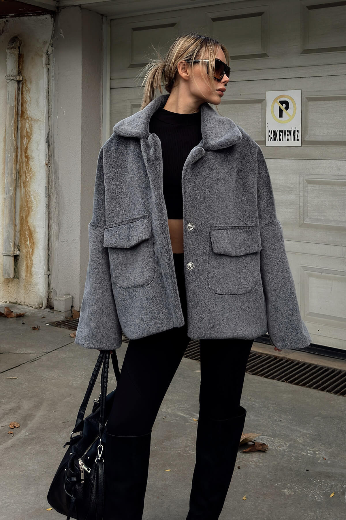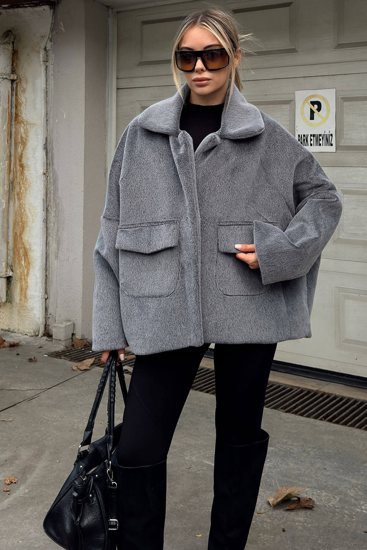 Füme Çift Kapak Cepli Çıt Çıt Kapama Tay Tüyü Oversize Kadın Mont