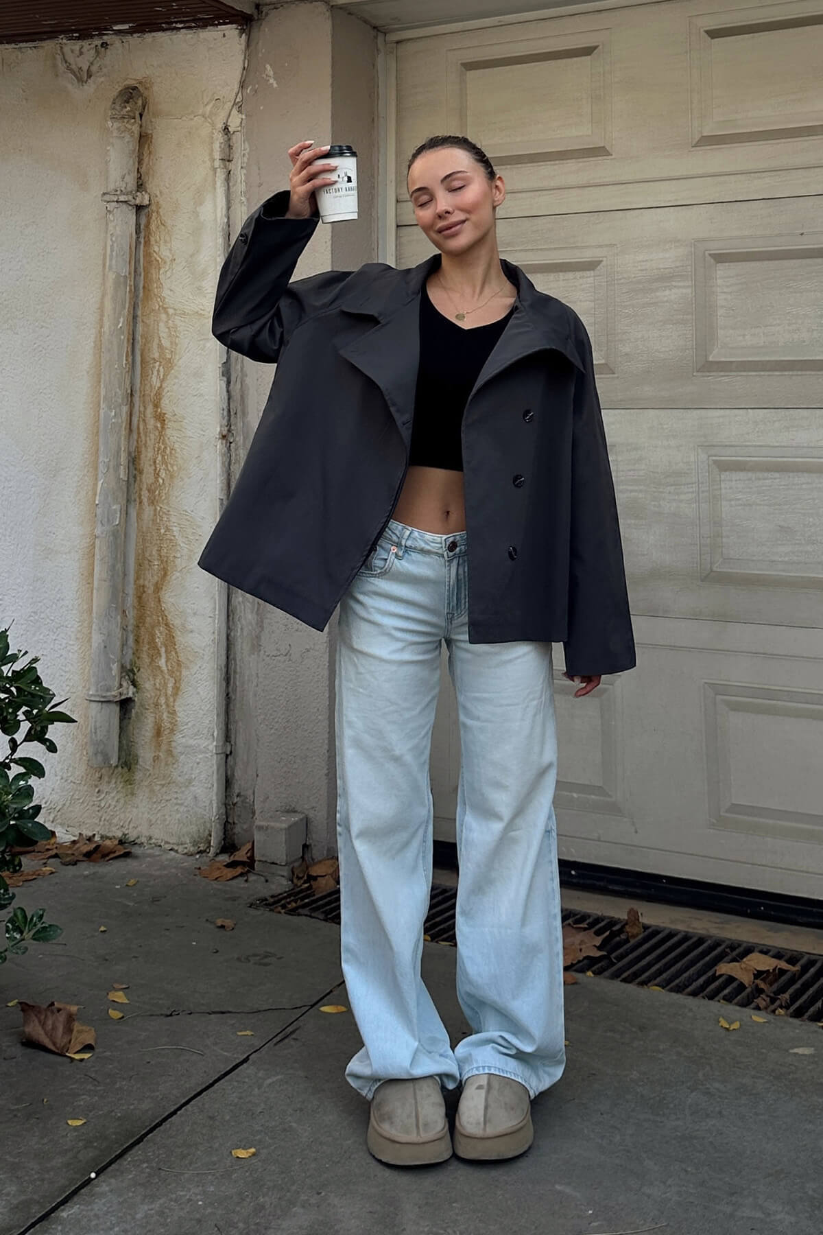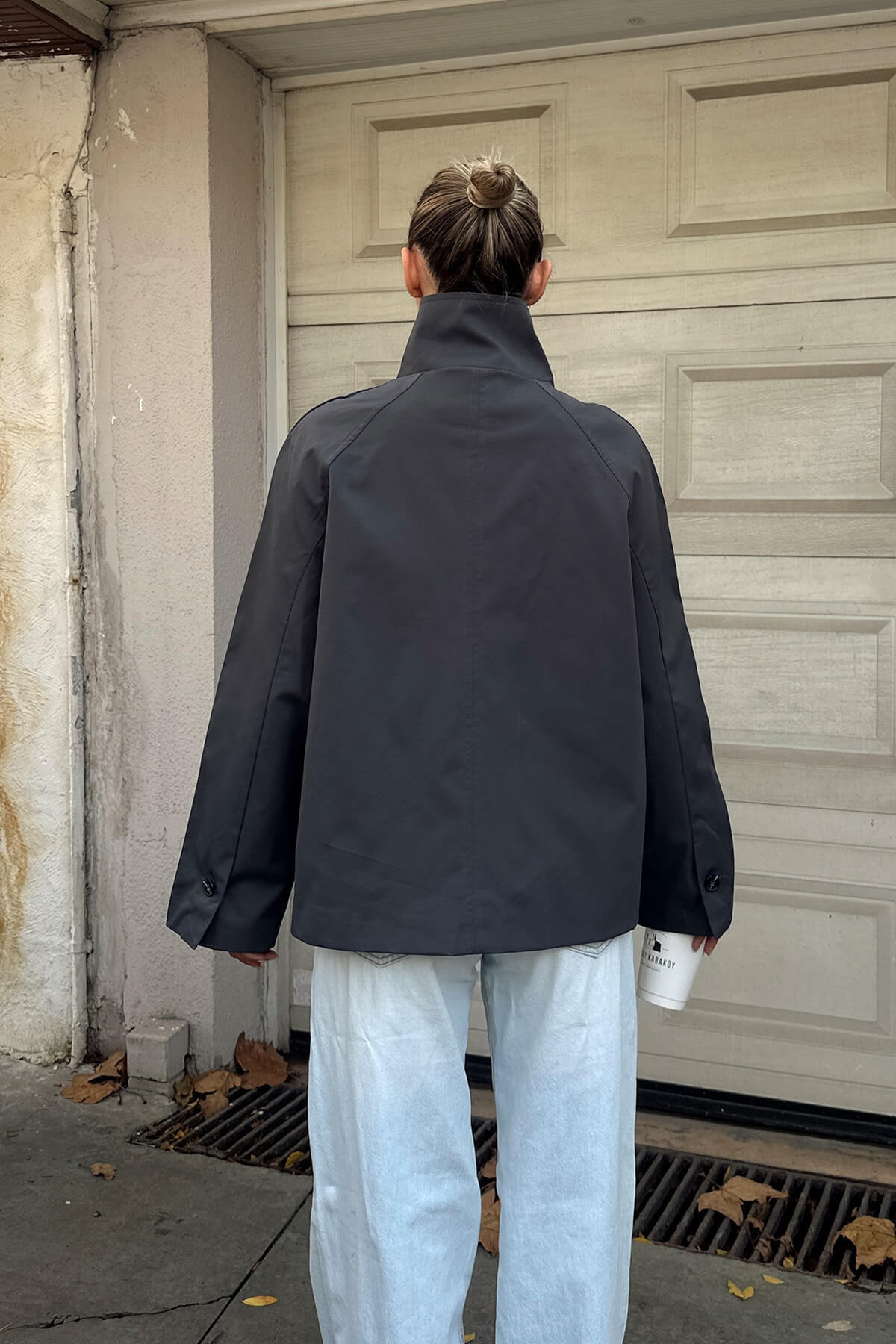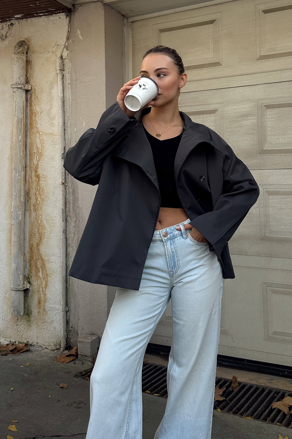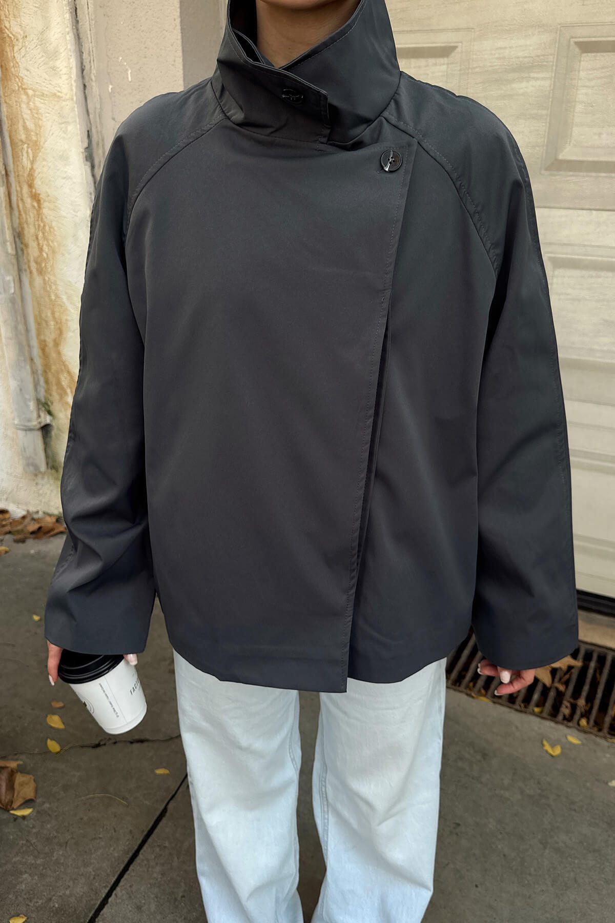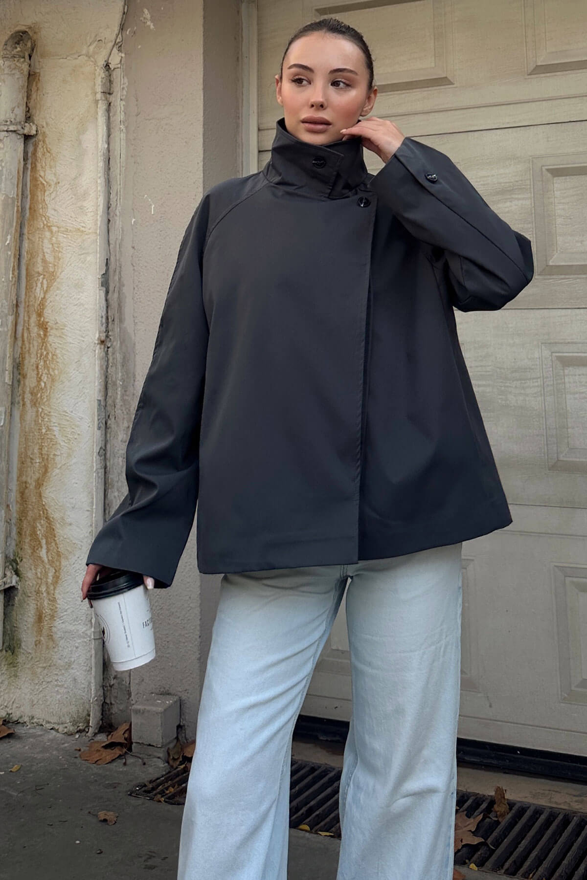 Füme Dik Yaka Verev Kapama Düğme Detaylı Kadın Kısa Trençkot