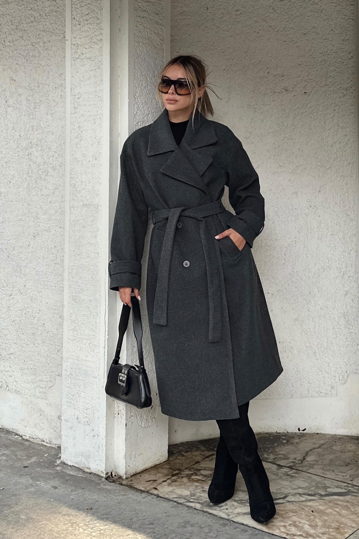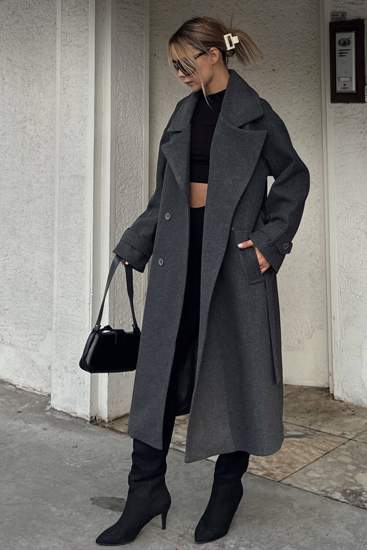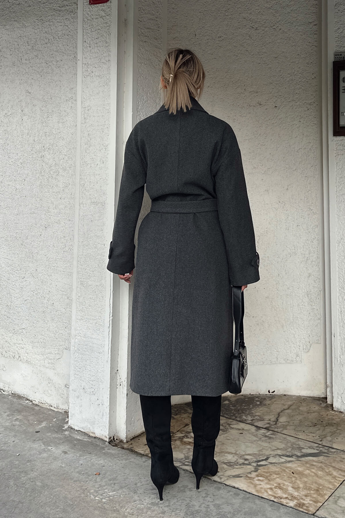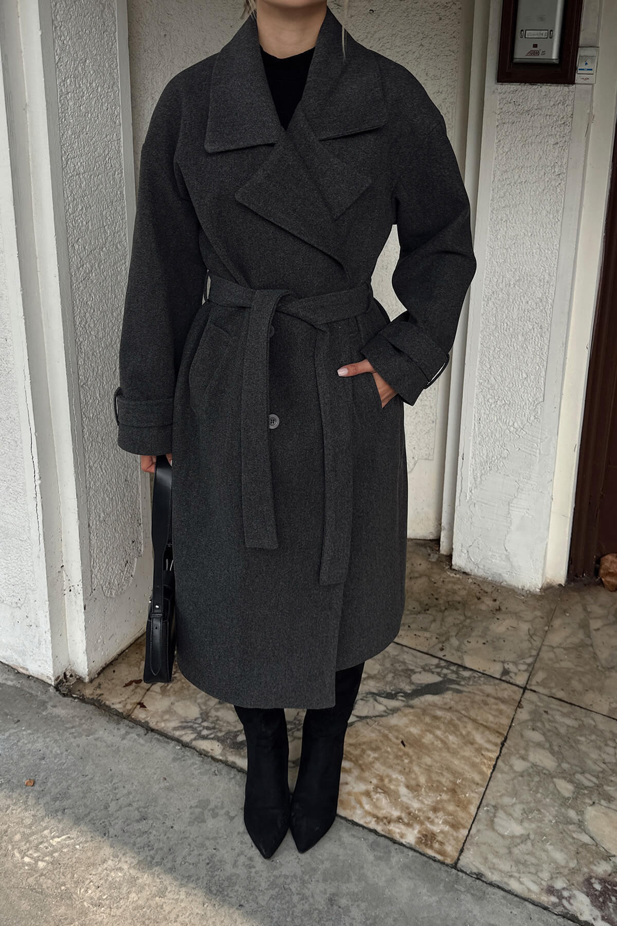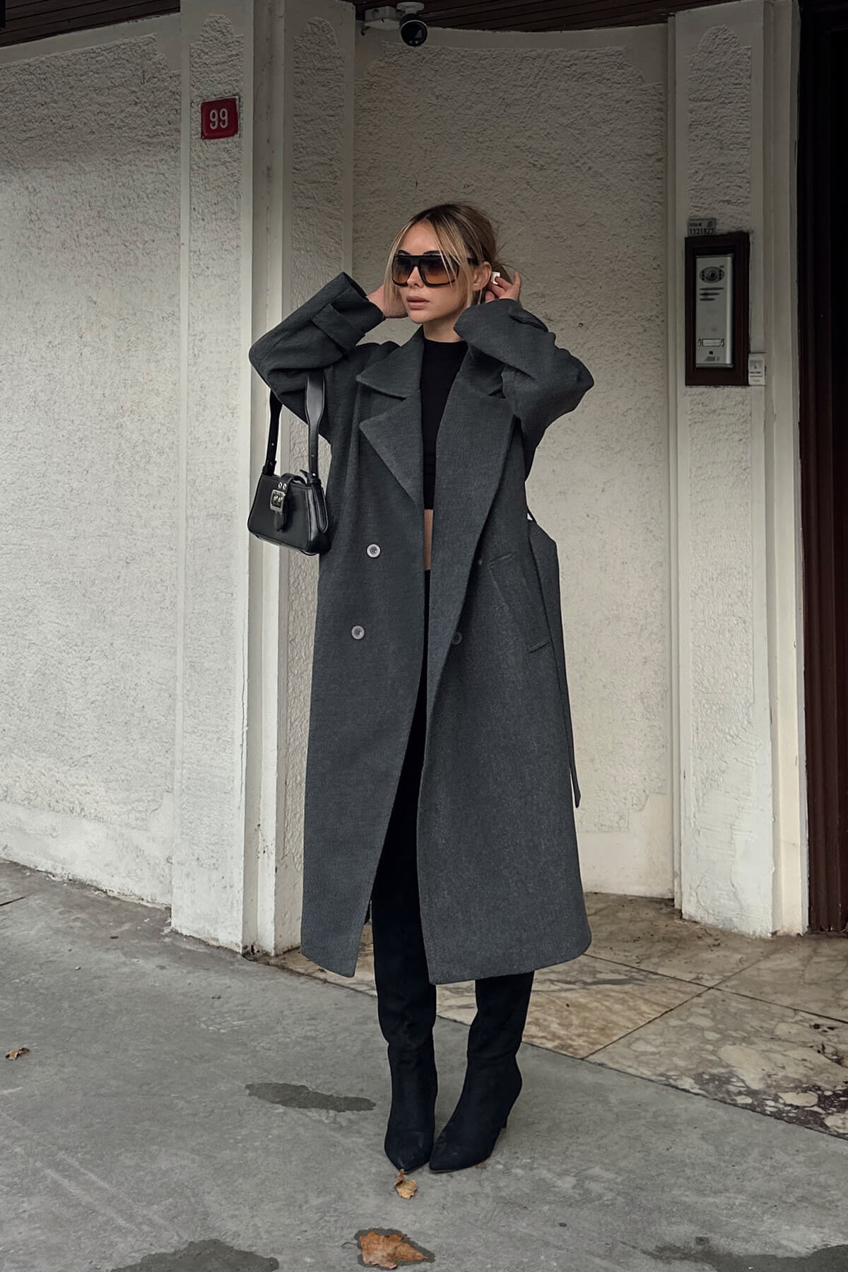 Füme Kruvaze Kol Manşetli Kuşaklı Astarlı Uzun Kadın Midi Kaşe Kaban
