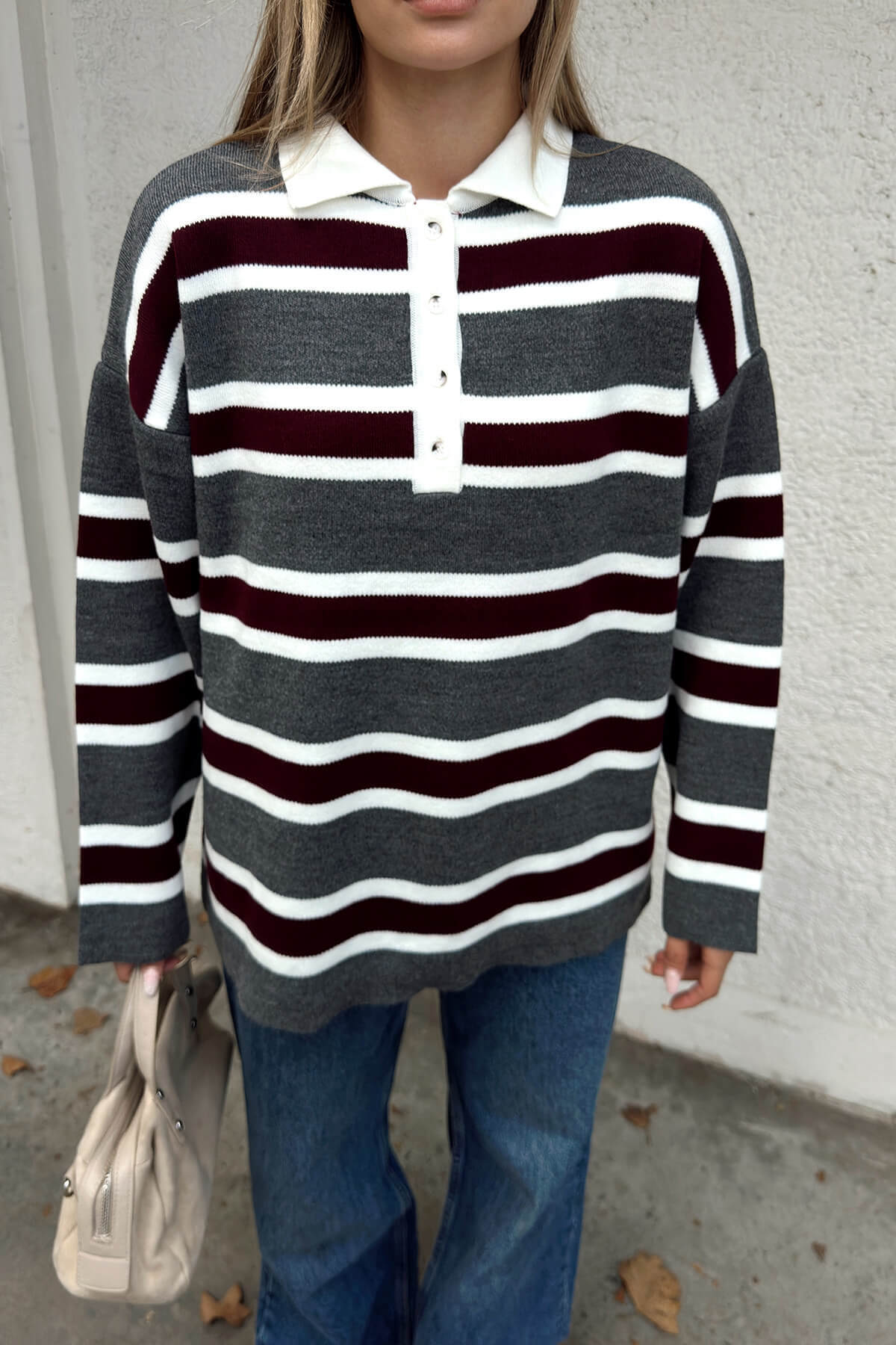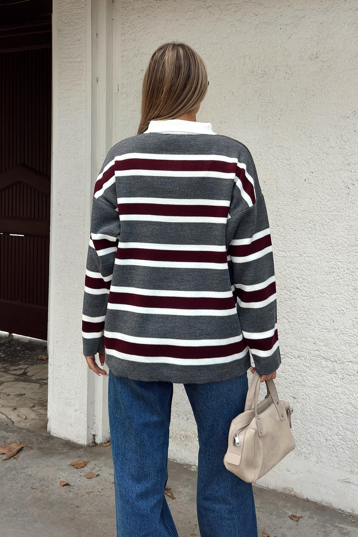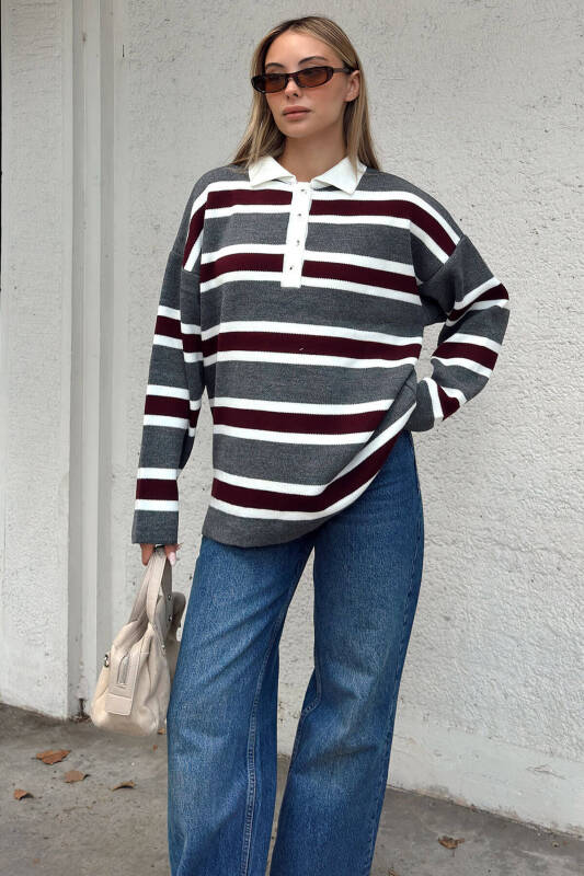 Füme Polo Yaka Kalın Çizgili Kadın Triko Kazak - 3