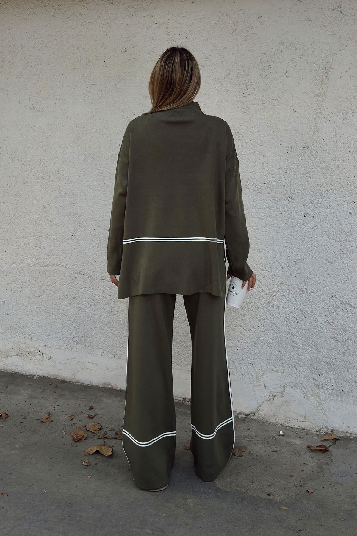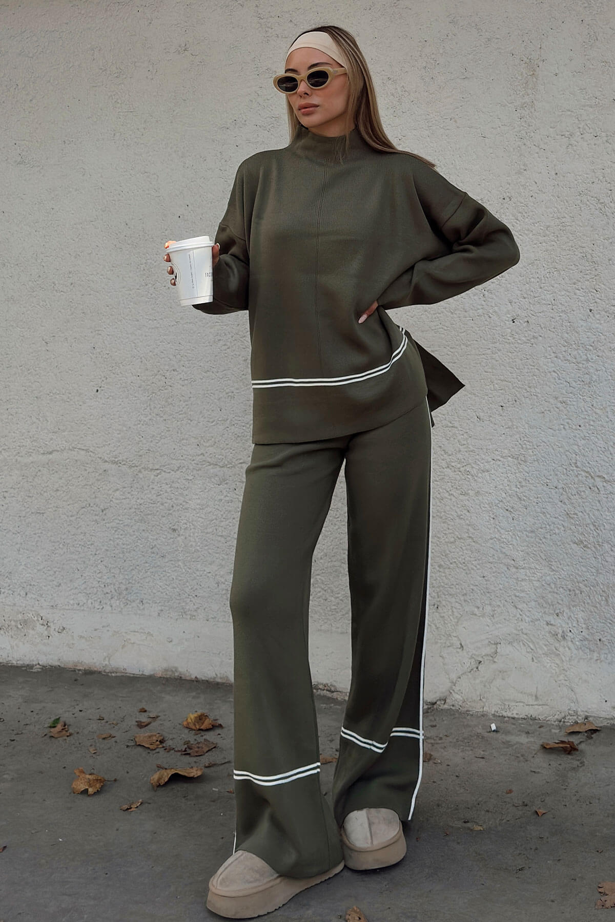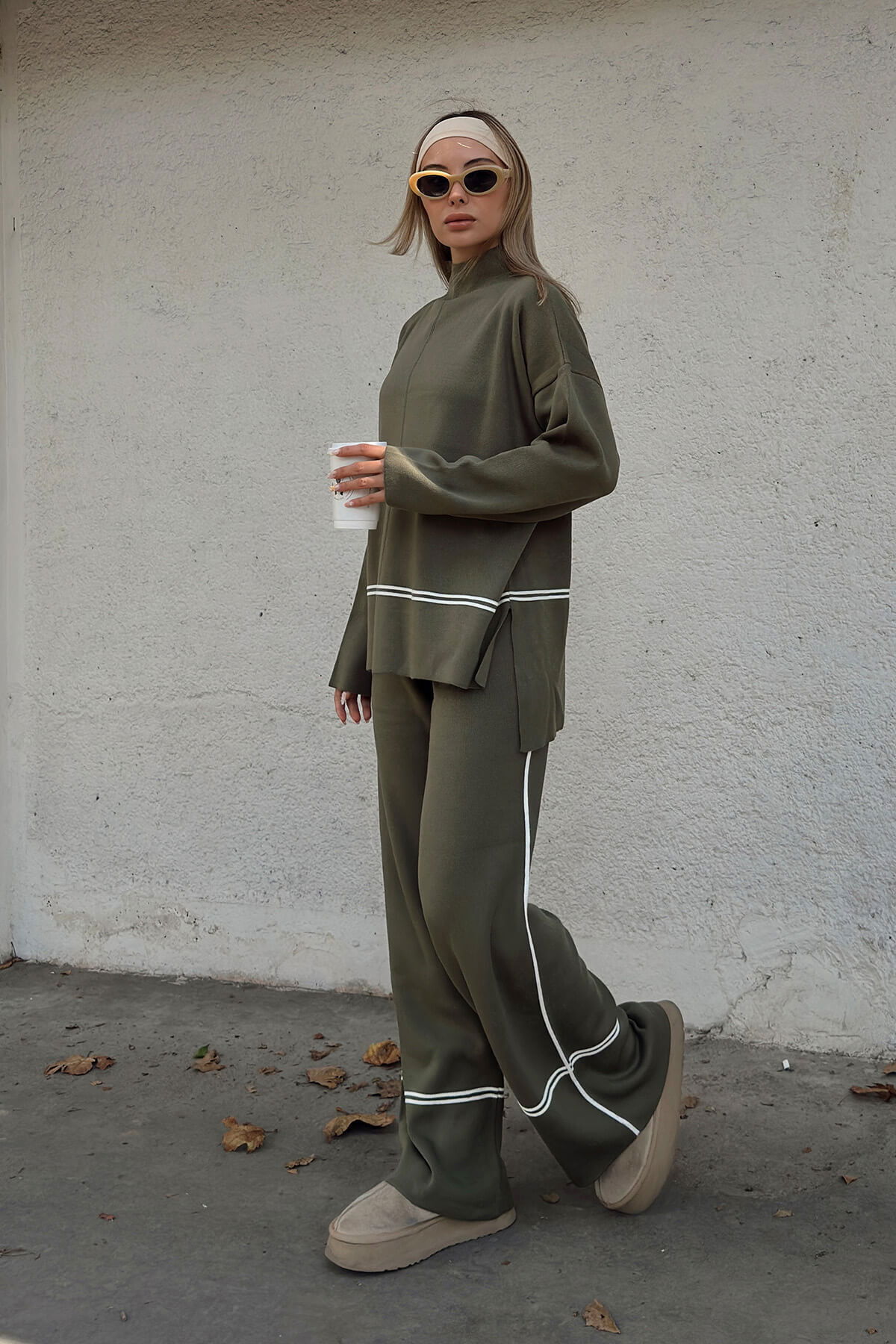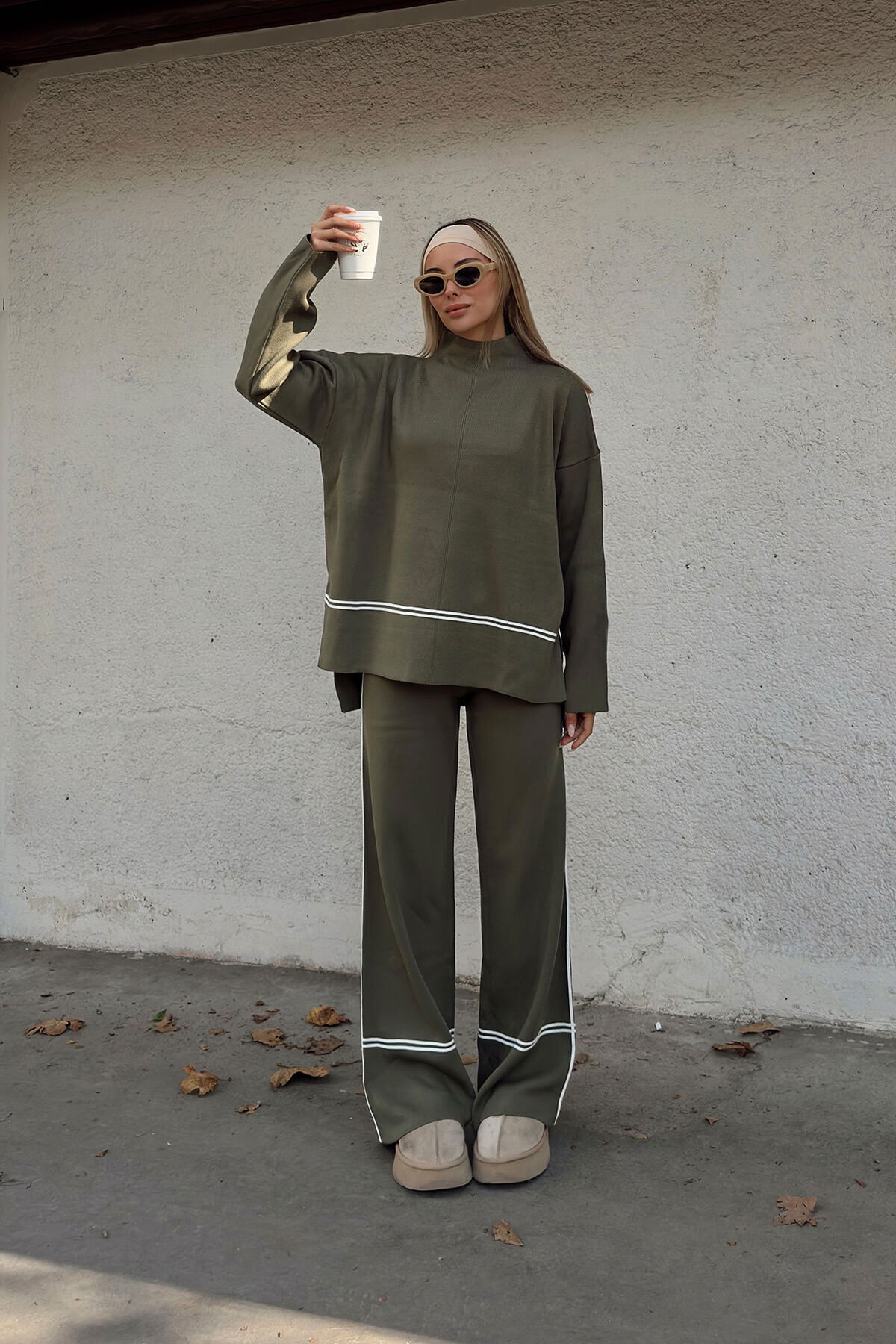 Haki Step Şerit Detaylı Dik Yaka Arkası Uzun Kazak-Pantolon Kadın Triko Alt Üst Takım - 1