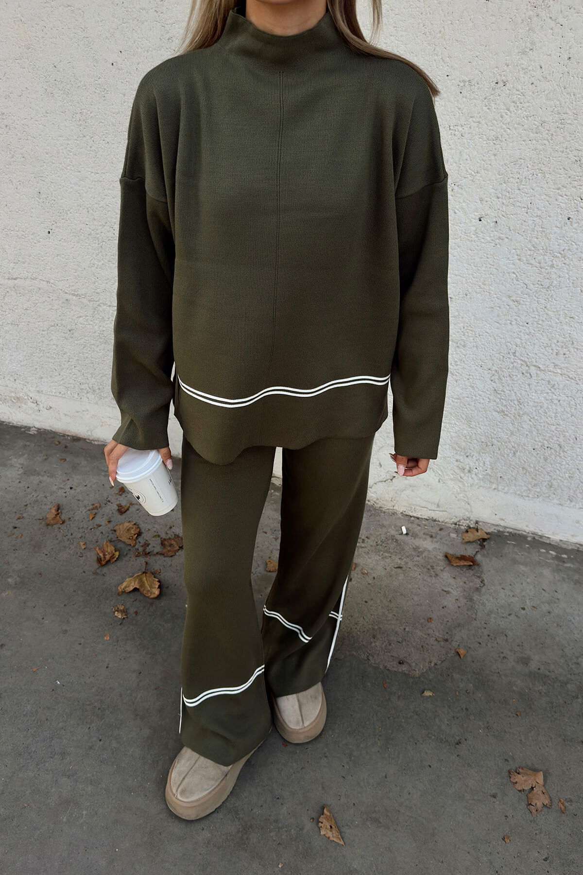 Haki Step Şerit Detaylı Dik Yaka Arkası Uzun Kazak-Pantolon Kadın Triko Alt Üst Takım