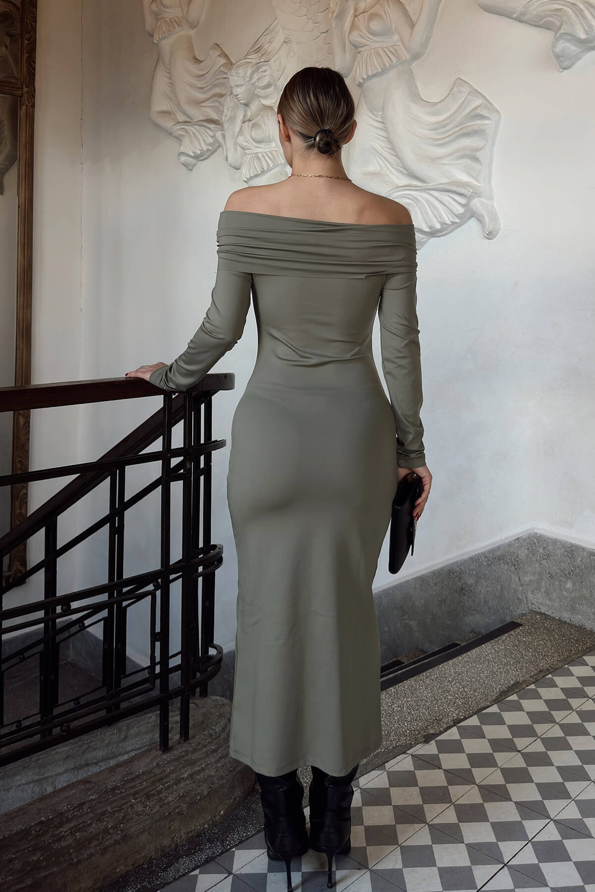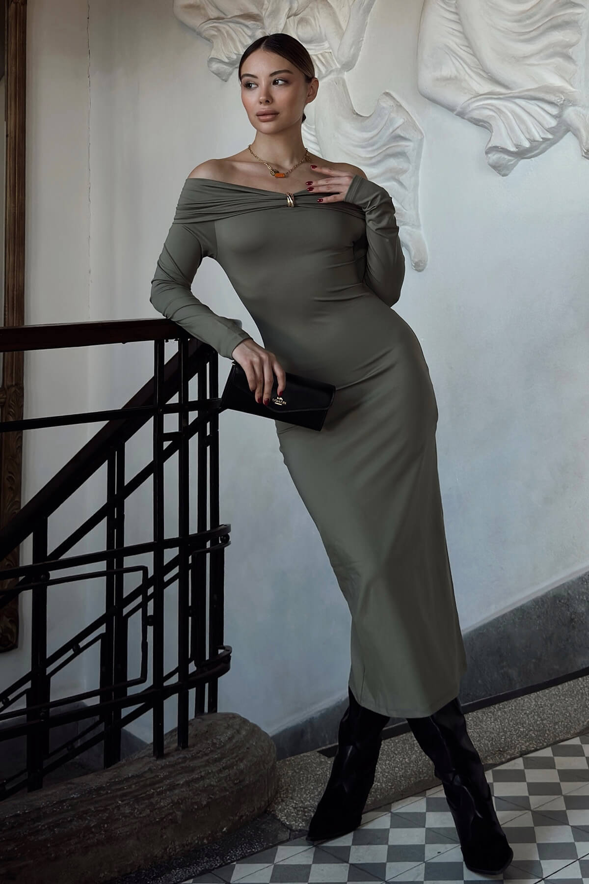 Haki Toka Detaylı Madonna Yaka Uzun Kollu Kadın Sandy Midi Elbise