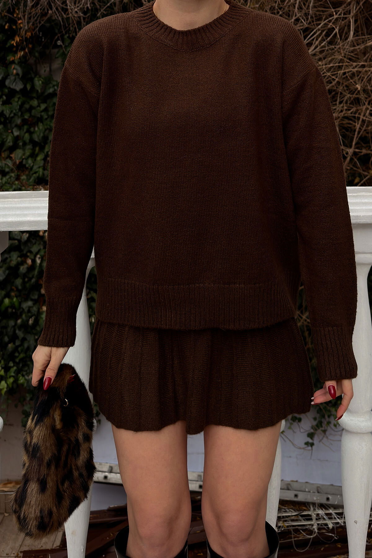Kahverengi Paloma Piliseli Etek-Bisiklet Yaka Kazak Kadın Triko Alt Üst Takım