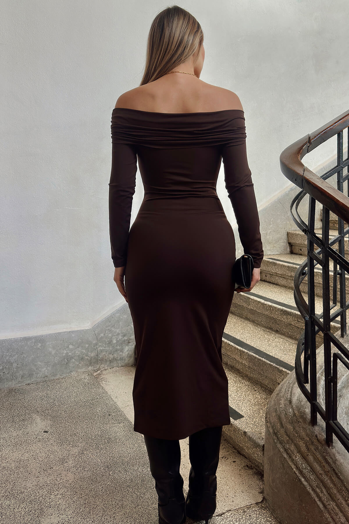 Kahverengi Toka Detaylı Madonna Yaka Uzun Kollu Kadın Sandy Midi Elbise