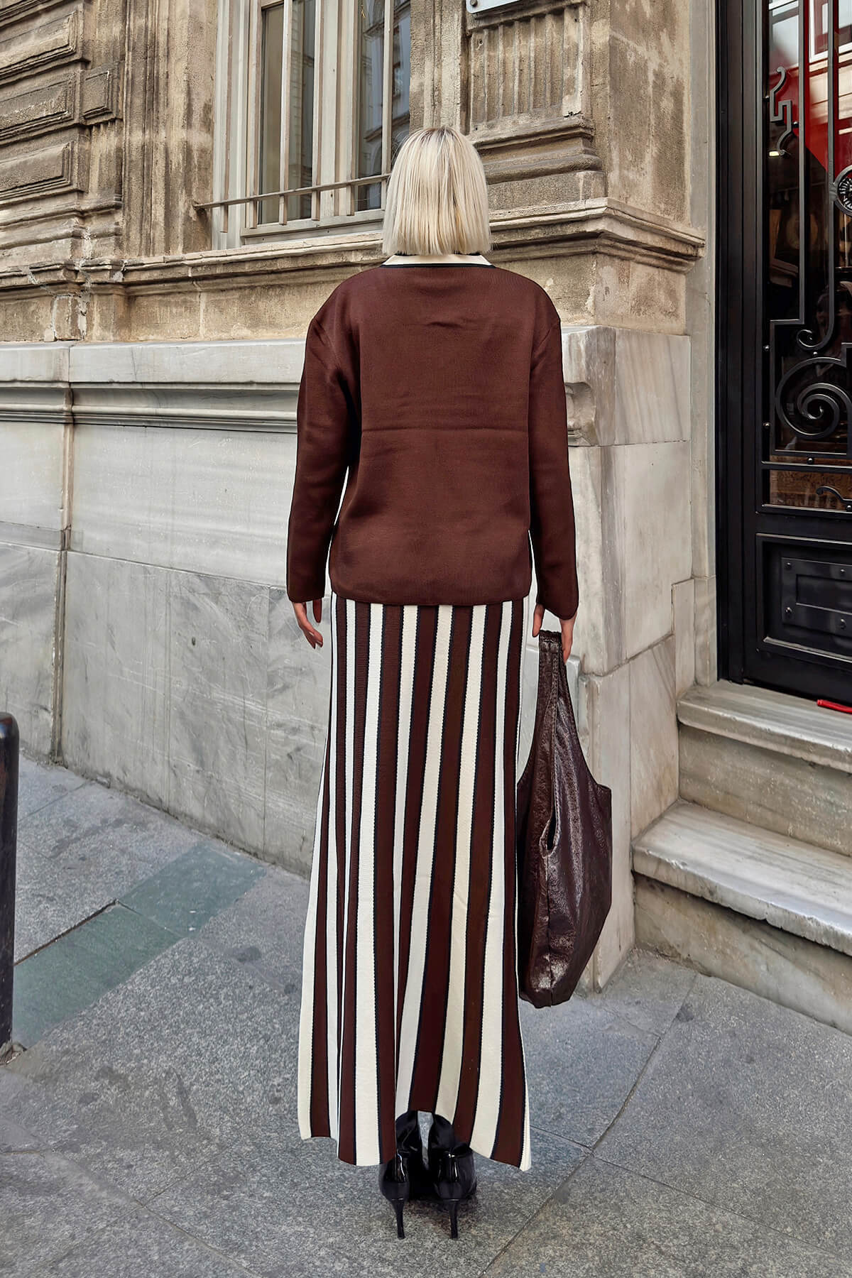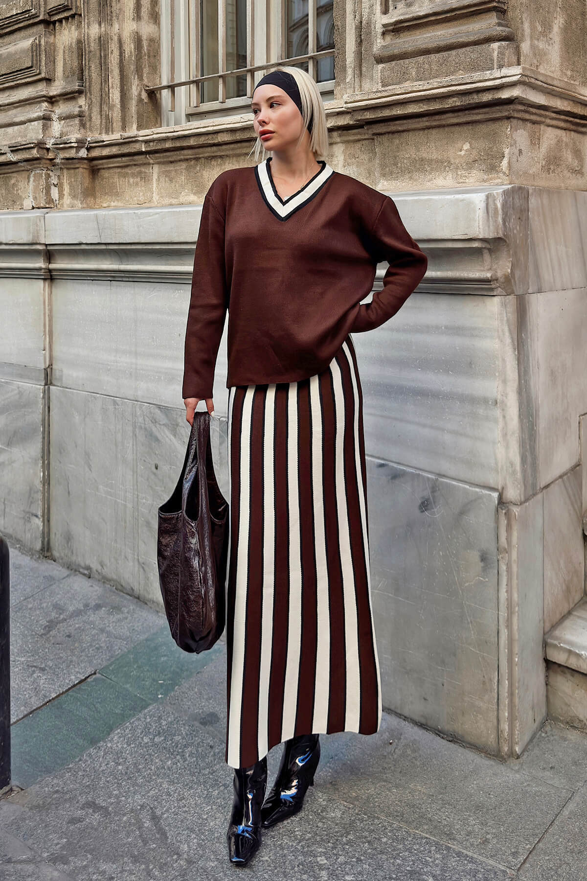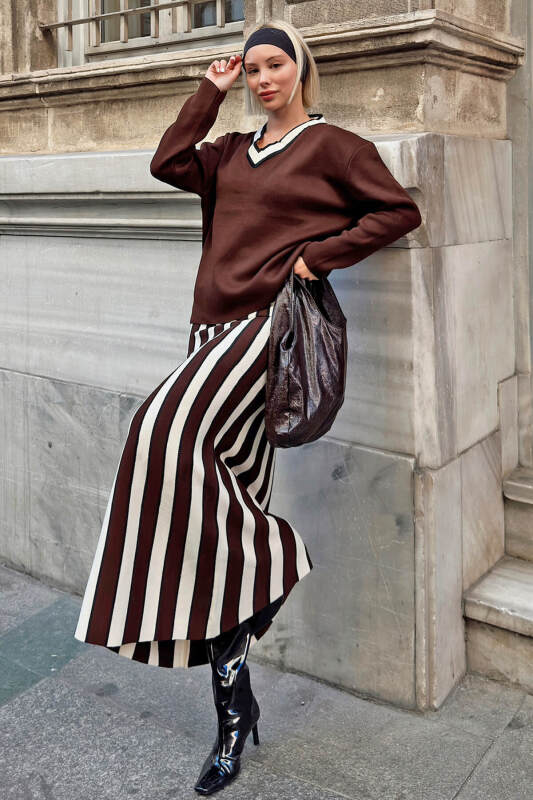 V Yaka, Çizgili Örgü Kazak-Etek Kadın Midi Alt-Üst Takım, sofistike ve modern bir stil arayan kadınlar için mükemmel bir seçenektir. Yumuşak örgü kumaşı, hem konfor hem de şıklık sunarken, çizgili deseni takıma dinamik bir görünüm kazandırır. V yaka kazak, zarif ve feminen bir dokunuş sağlarken, midi boy etek ile mükemmel bir uyum oluşturur. Bu alt-üst takım, ofis şıklığından günlük giyime kadar geniş bir yelpazede kullanılabilir, her ortamda dikkat çekici bir görünüm sağlar. Farklı renk seçenekleri ile sunulan bu triko takım, her tarza hitap eder ve zahmetsizce şık bir kombin oluşturmanıza olanak tanır. Kaliteli malzemesi ile uzun ömürlü bir kullanım sunan bu takım, gardırobunuzun vazgeçilmezlerinden biri olacaktır. Şimdi sipariş vererek, stilinize zarif ve modern bir dokunuş katın.