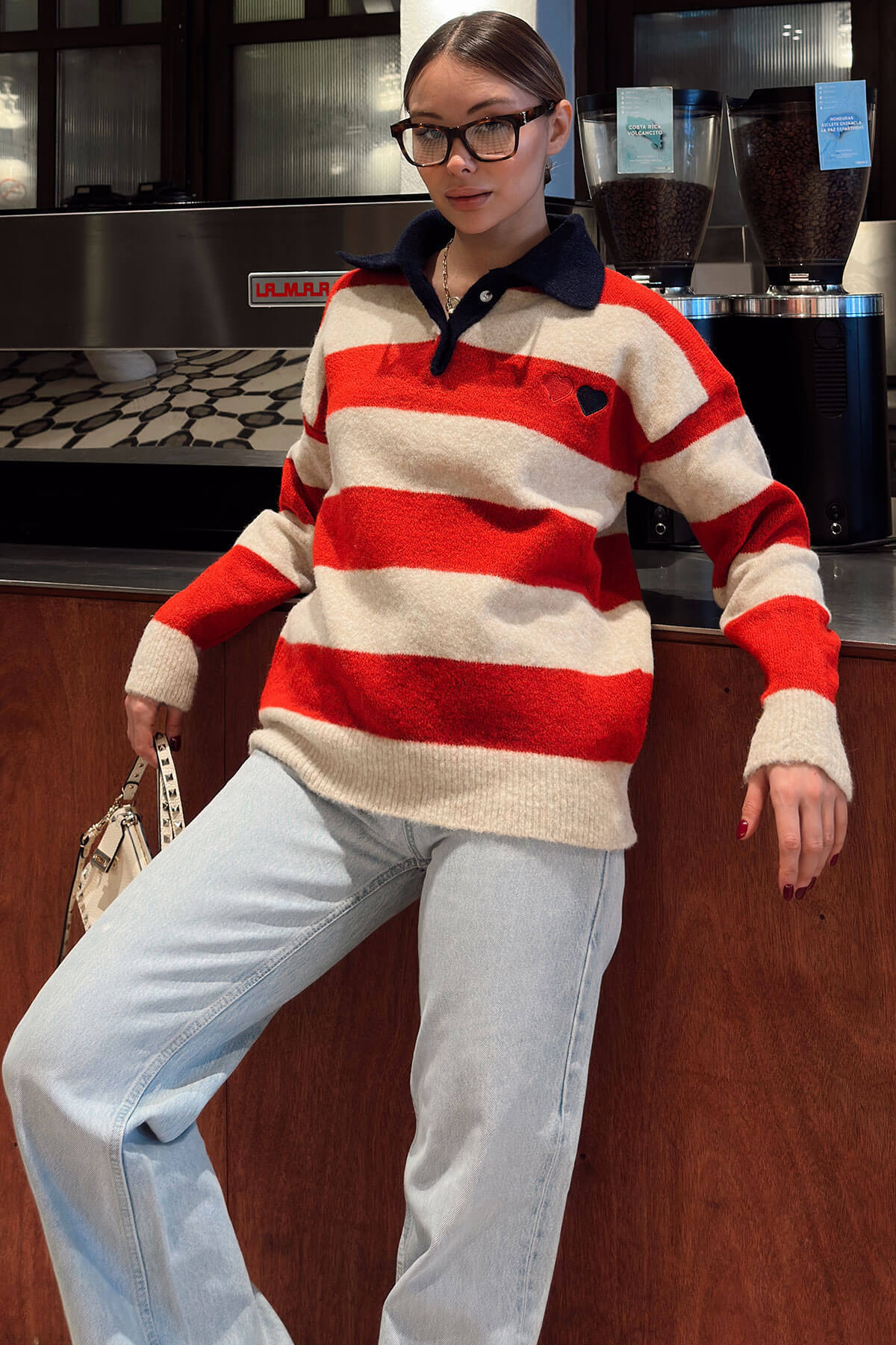 Kırmızı Polo Yaka Garnili Kalın Çizgili Kalp Nakışlı Kadın Triko Kazak