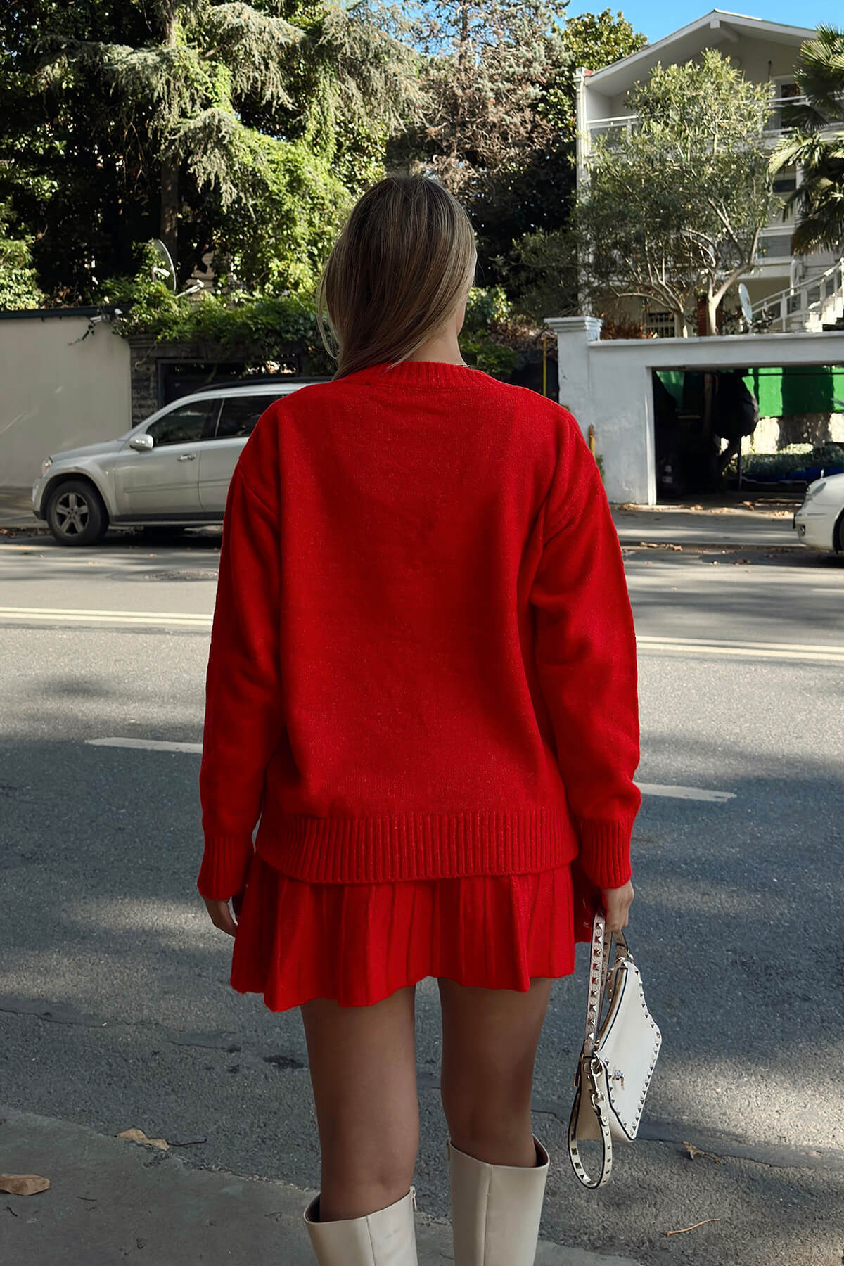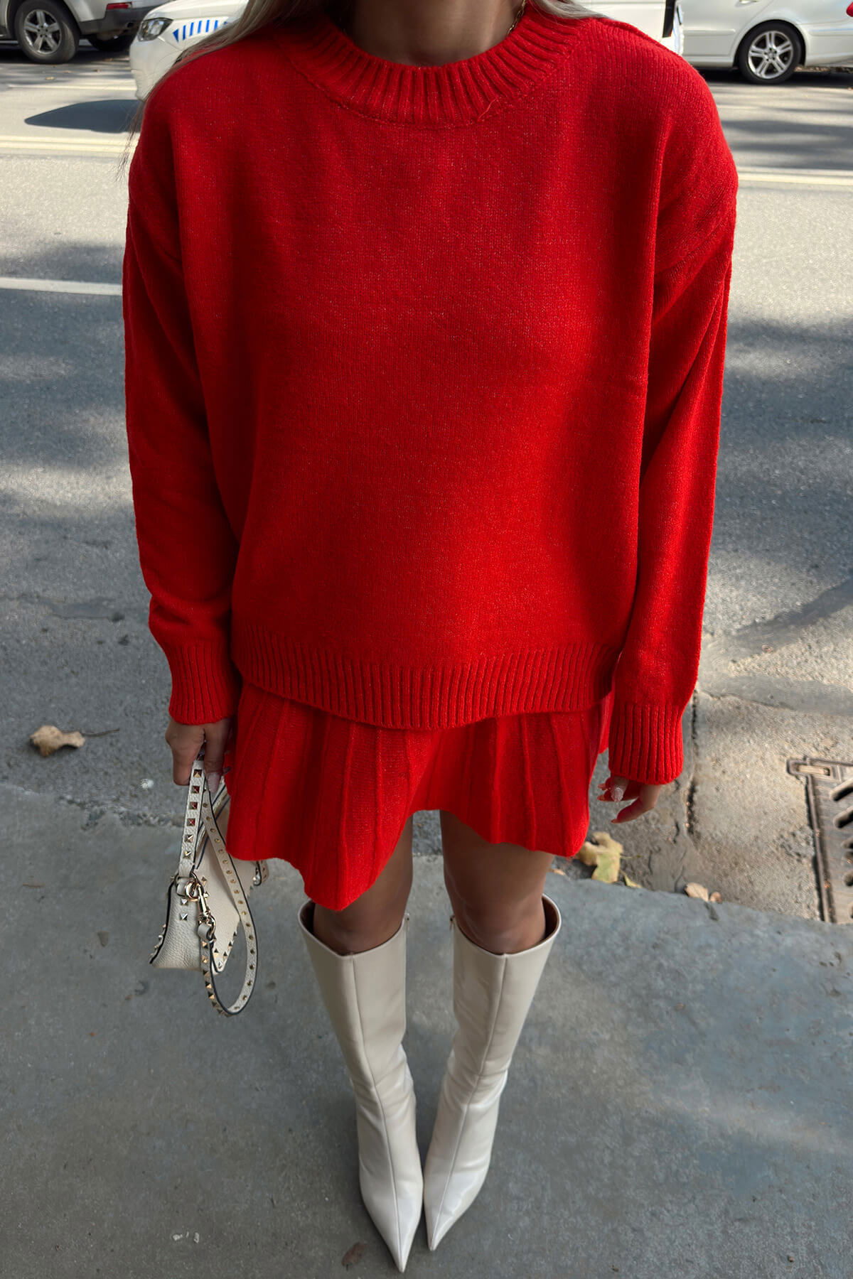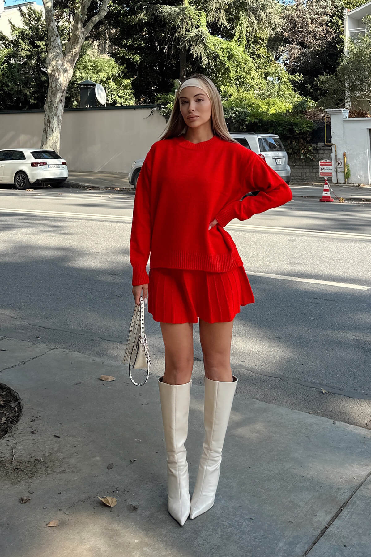 Nar Çiçeği Paloma Piliseli Etek-Bisiklet Yaka Kazak Kadın Triko Alt Üst Takım
