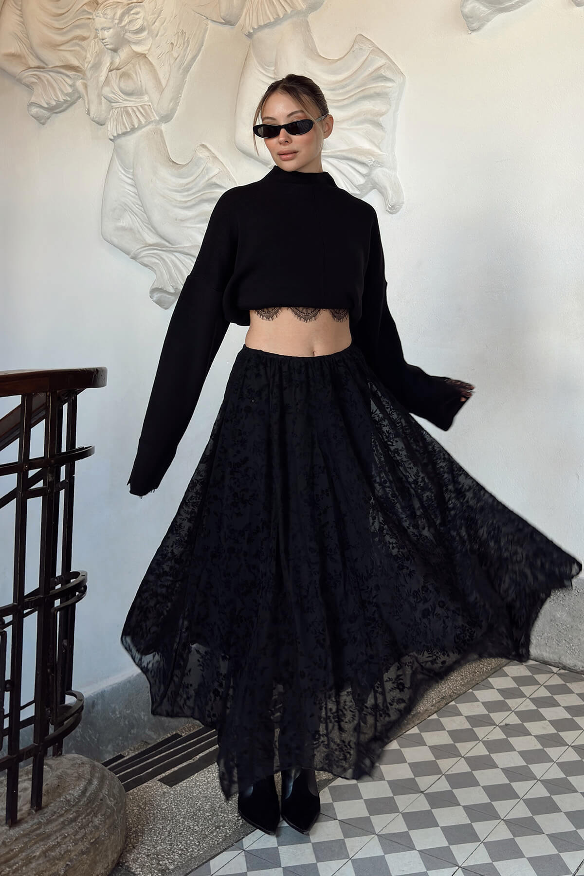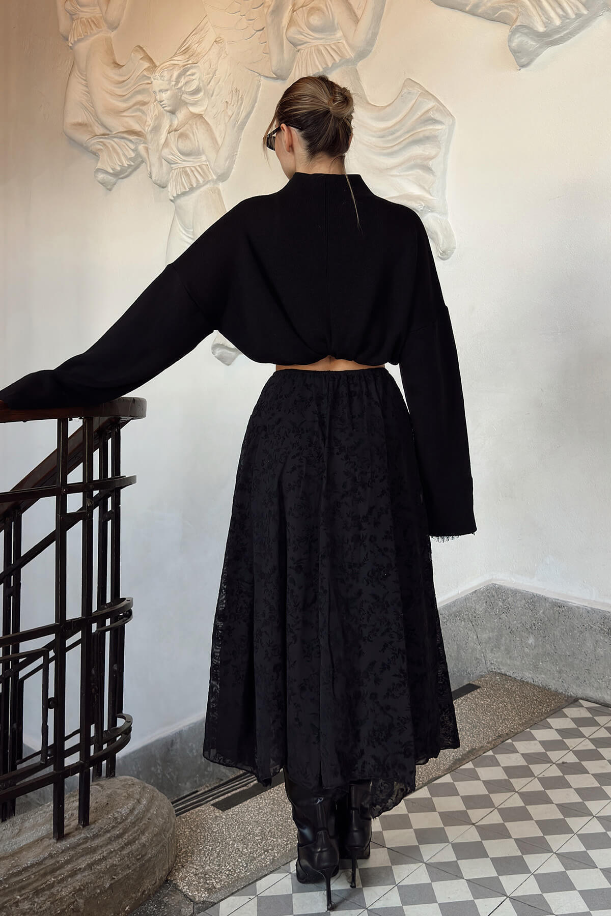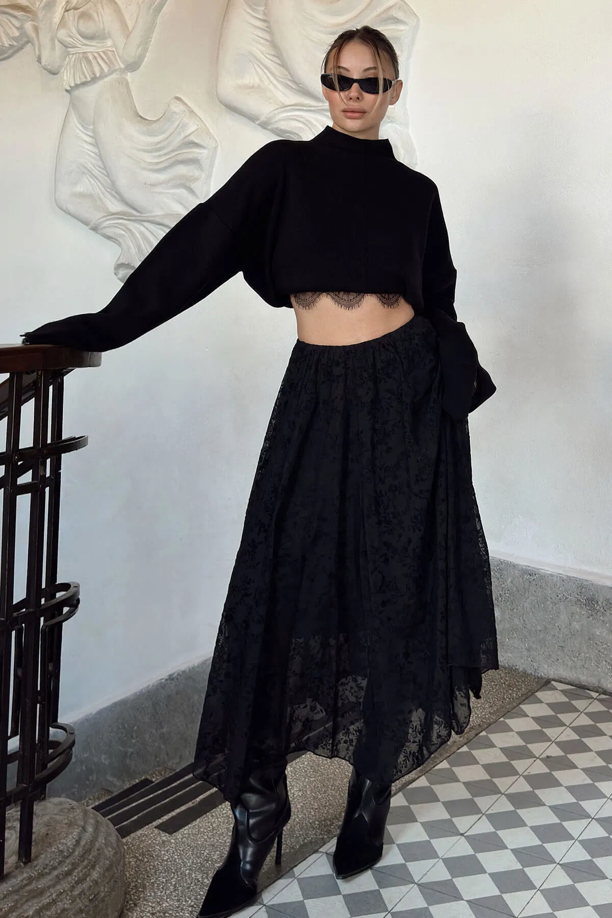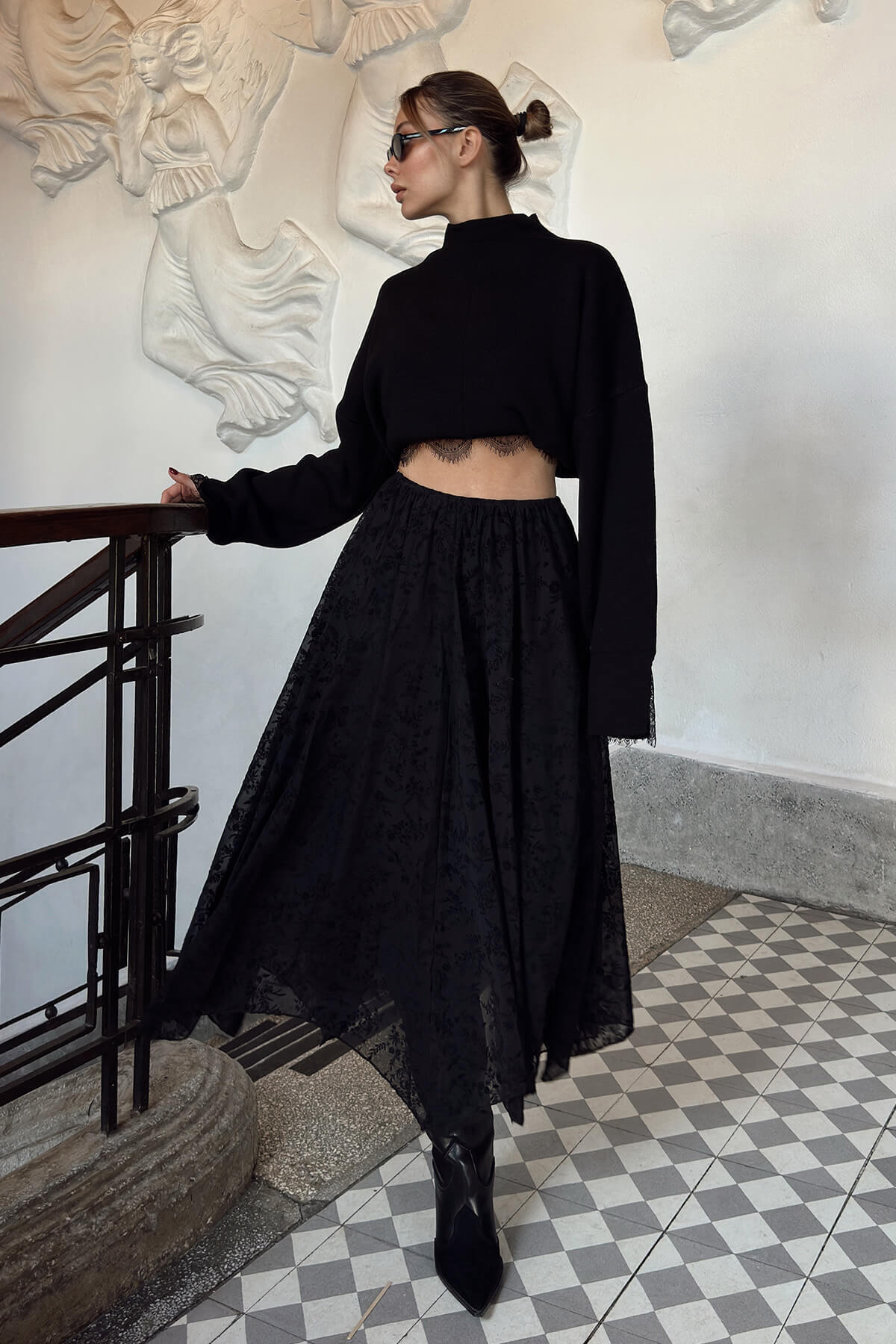 Siyah Beli Lastikli Astarlı Flok Baskılı Asimetrik Kadın Midi Etek