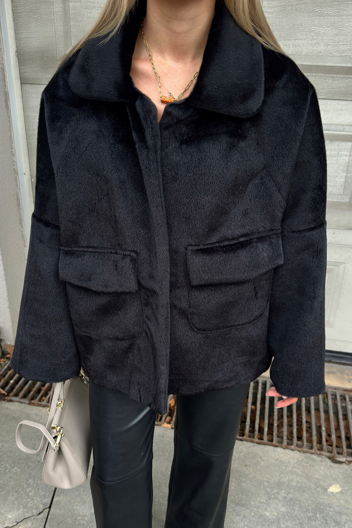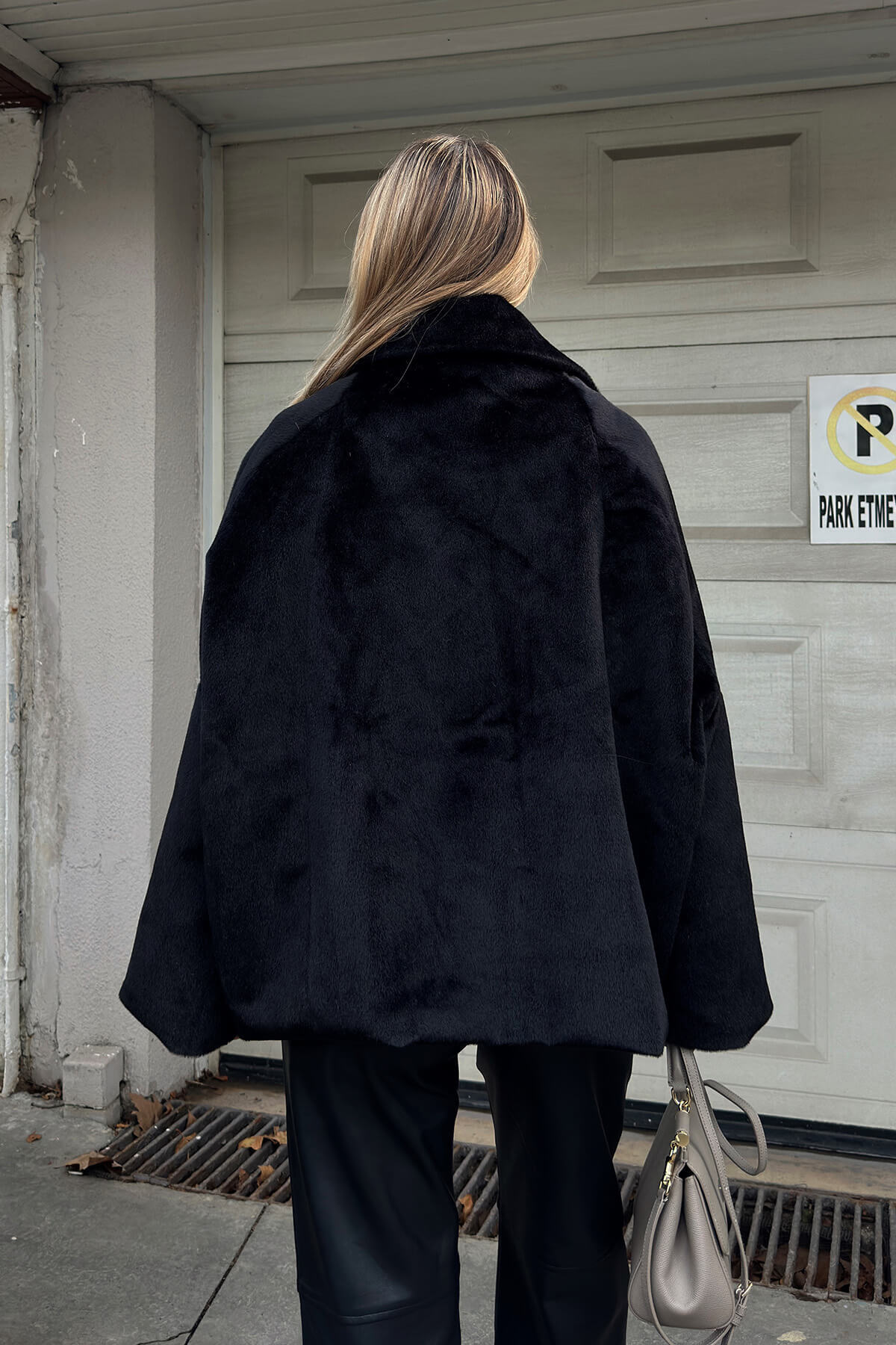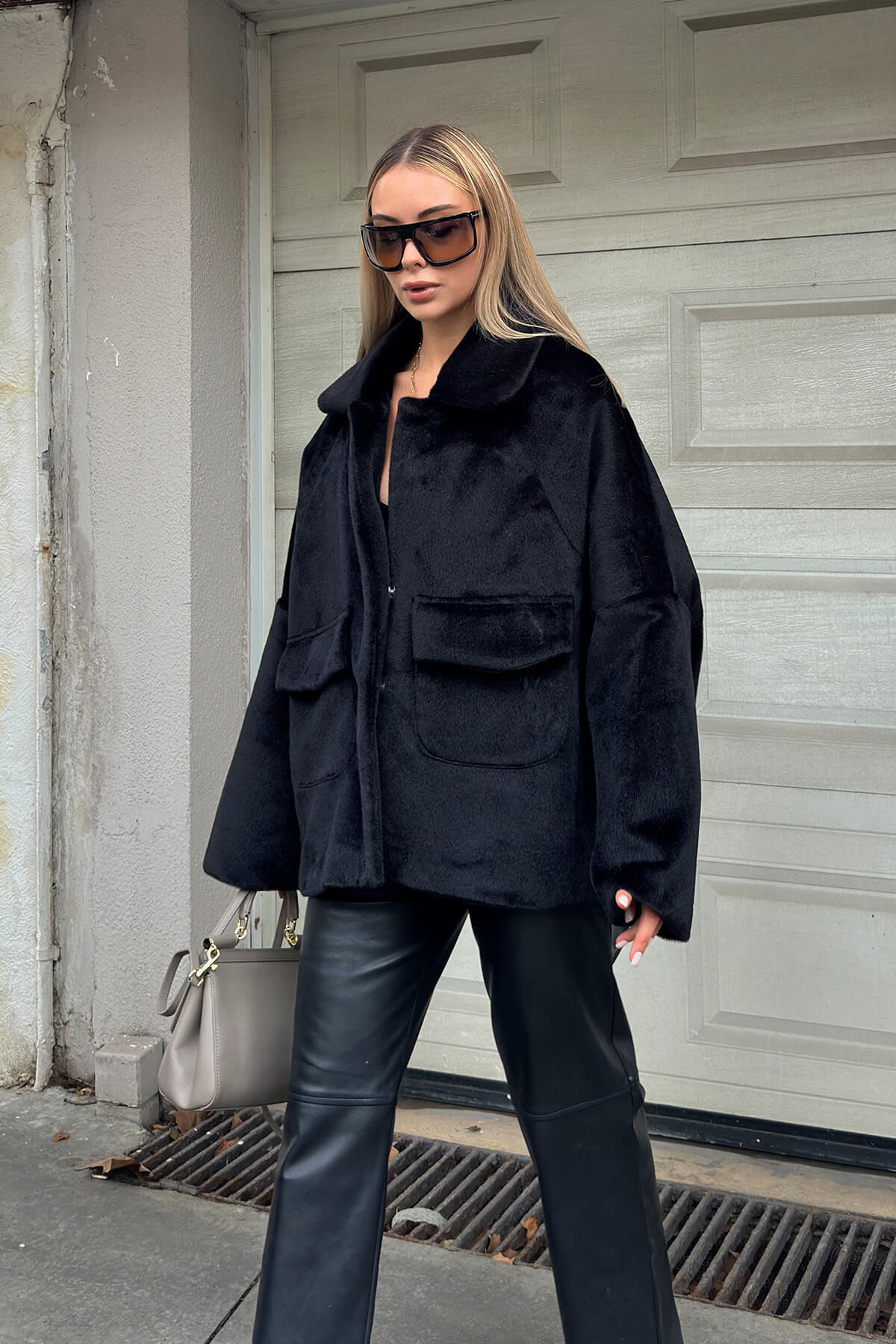 Siyah Çift Kapak Cepli Çıt Çıt Kapama Tay Tüyü Oversize Kadın Mont