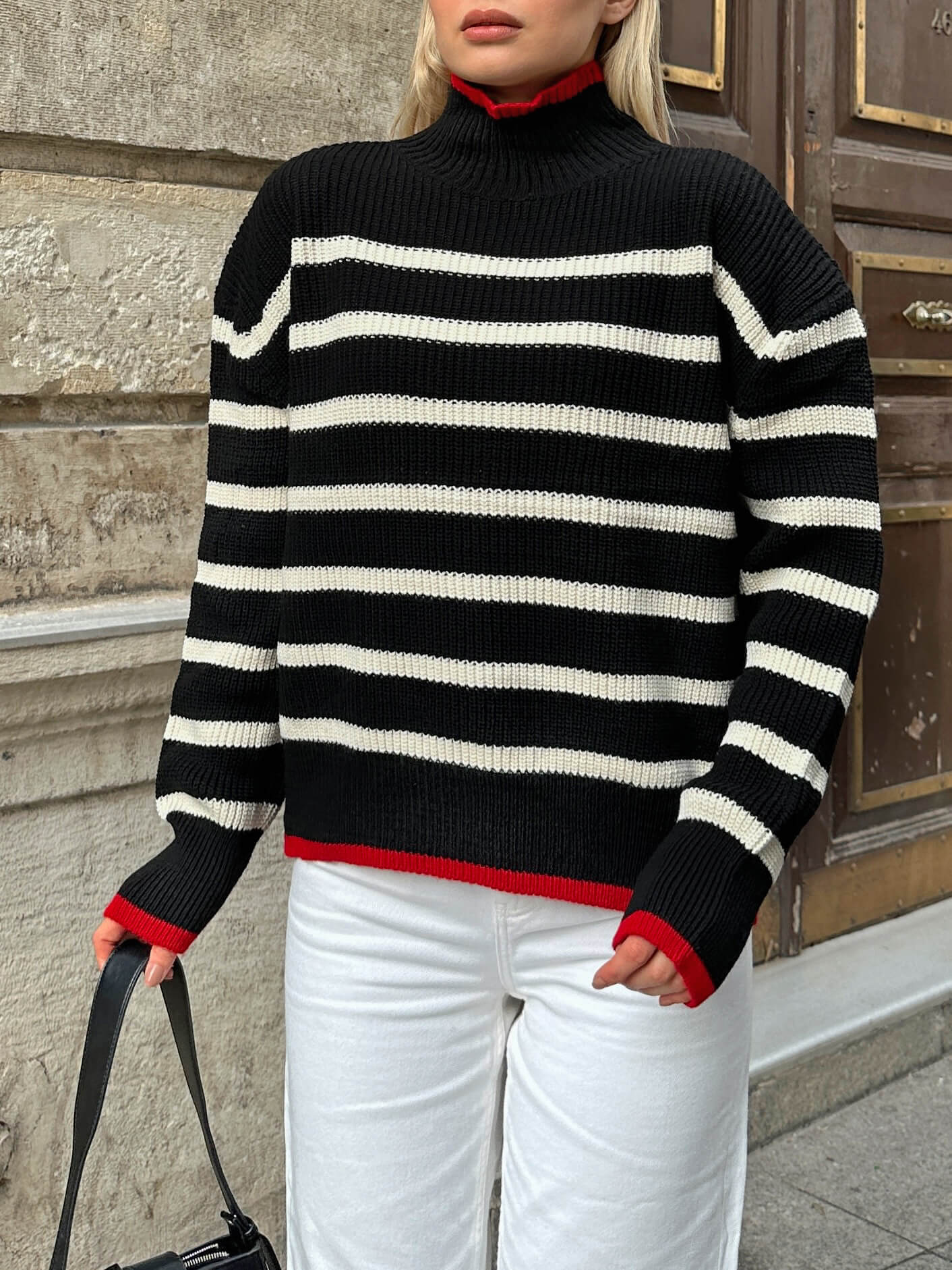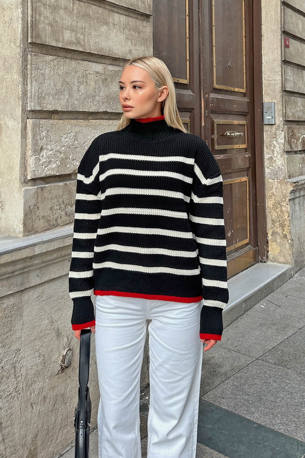Bu rahat ve stil sahibi kadın triko kazak, çizgili deseni ve yarım balıkçı yakasıyla kış gardırobunuzun can alıcı parçası olacak. Geniş kalıp tasarımı, modern ve rahat bir siluet sunarken, çizgili desenler klasik bir dokunuşla çağdaş stilin mükemmel birleşimini sergiliyor. Bu kazak, soğuk havalarda sizi sıcak tutacak yumuşak dokusuyla, rahat bir kış gününden şık bir akşam buluşmasına kadar her durumda mükemmel bir seçimdir. Yarım balıkçı yaka, soğuktan korurken şıklığından ödün vermeyen kadınlar için ideal bir detay sunuyor. Geniş ve rahat kesimiyle bu triko, hareket özgürlüğü sunarken, her türlü vücut tipine uyum sağlayarak kusursuz bir giyim deneyimi vaat ediyor. Bu çizgili triko kazak, gardırobunuzda zamansız bir parça olacak ve her giyimde sizi şık ve sıcak tutacak.