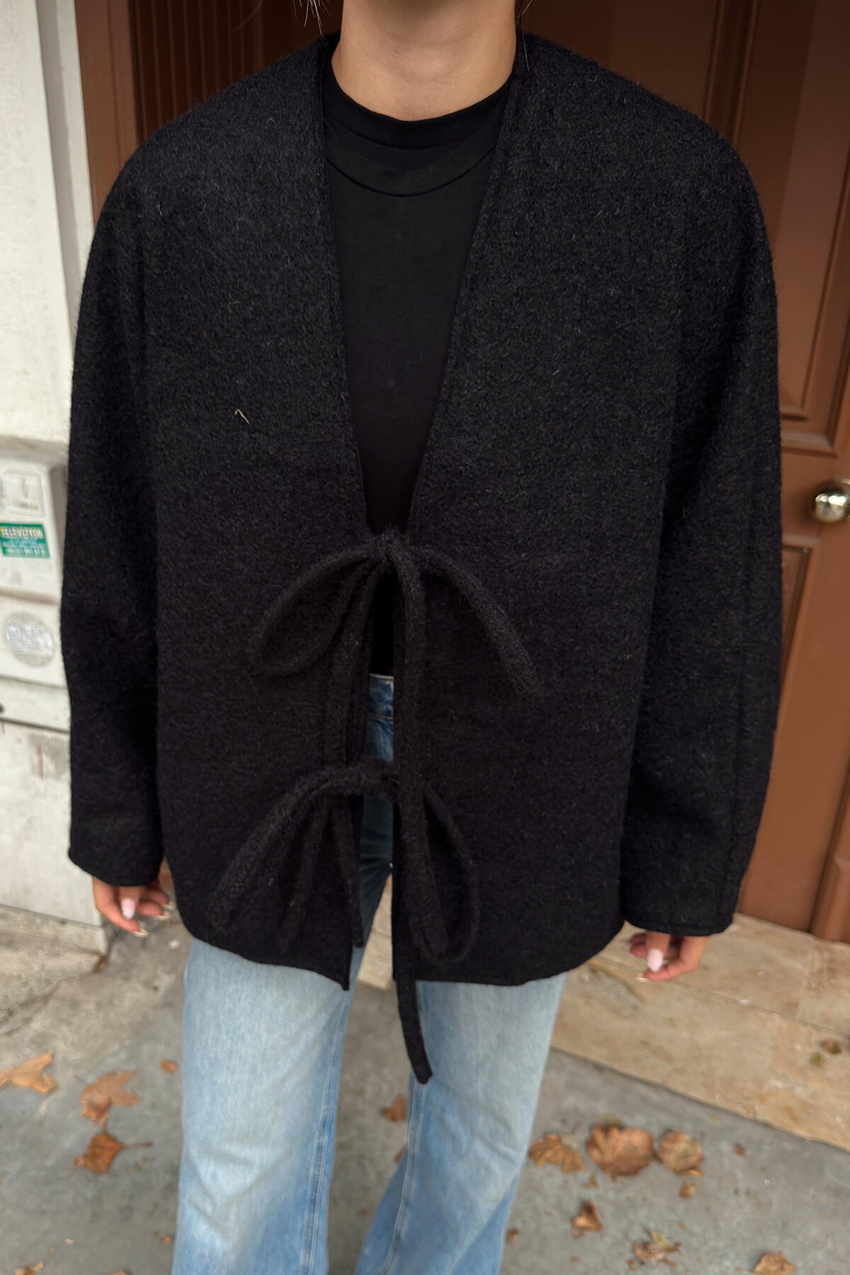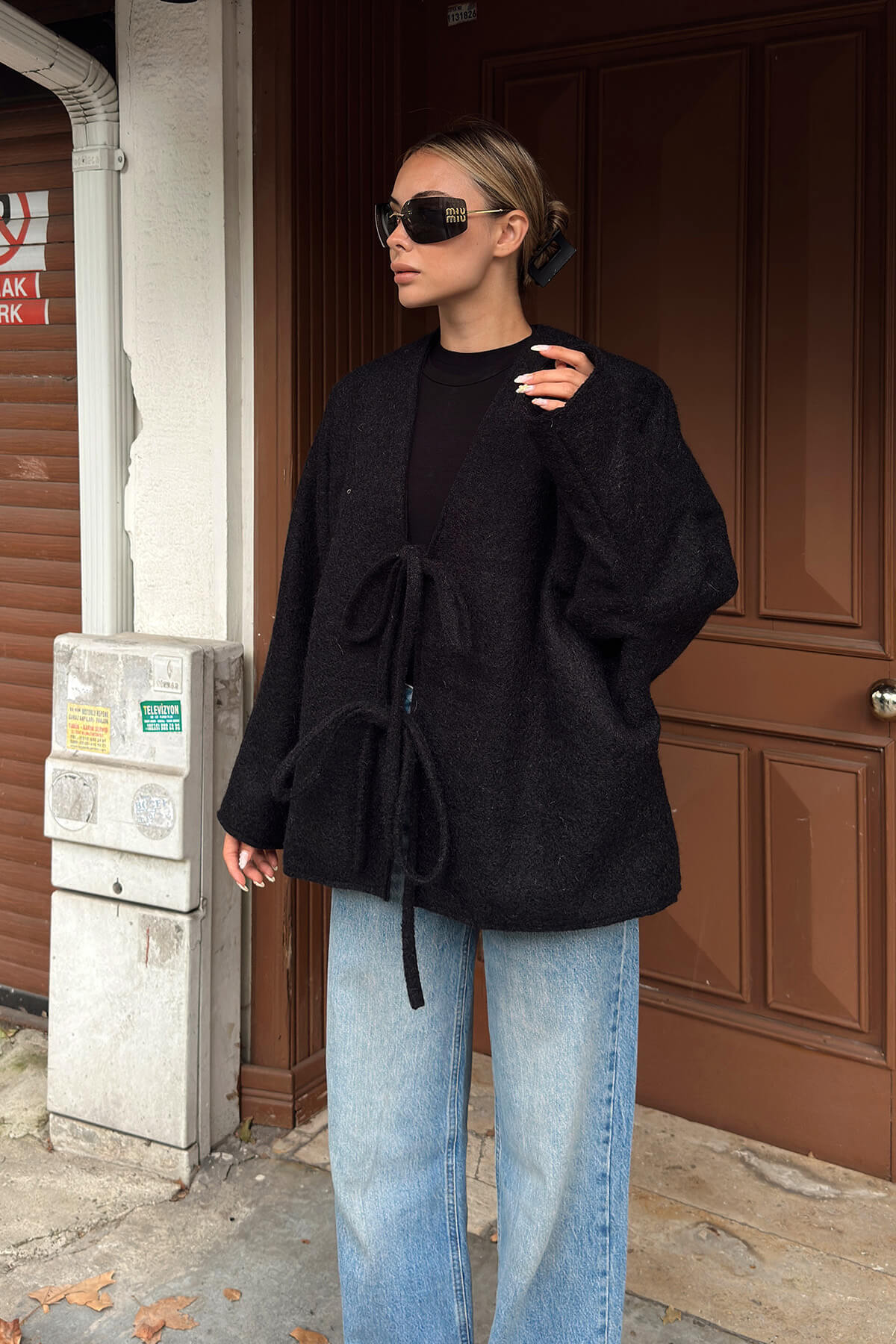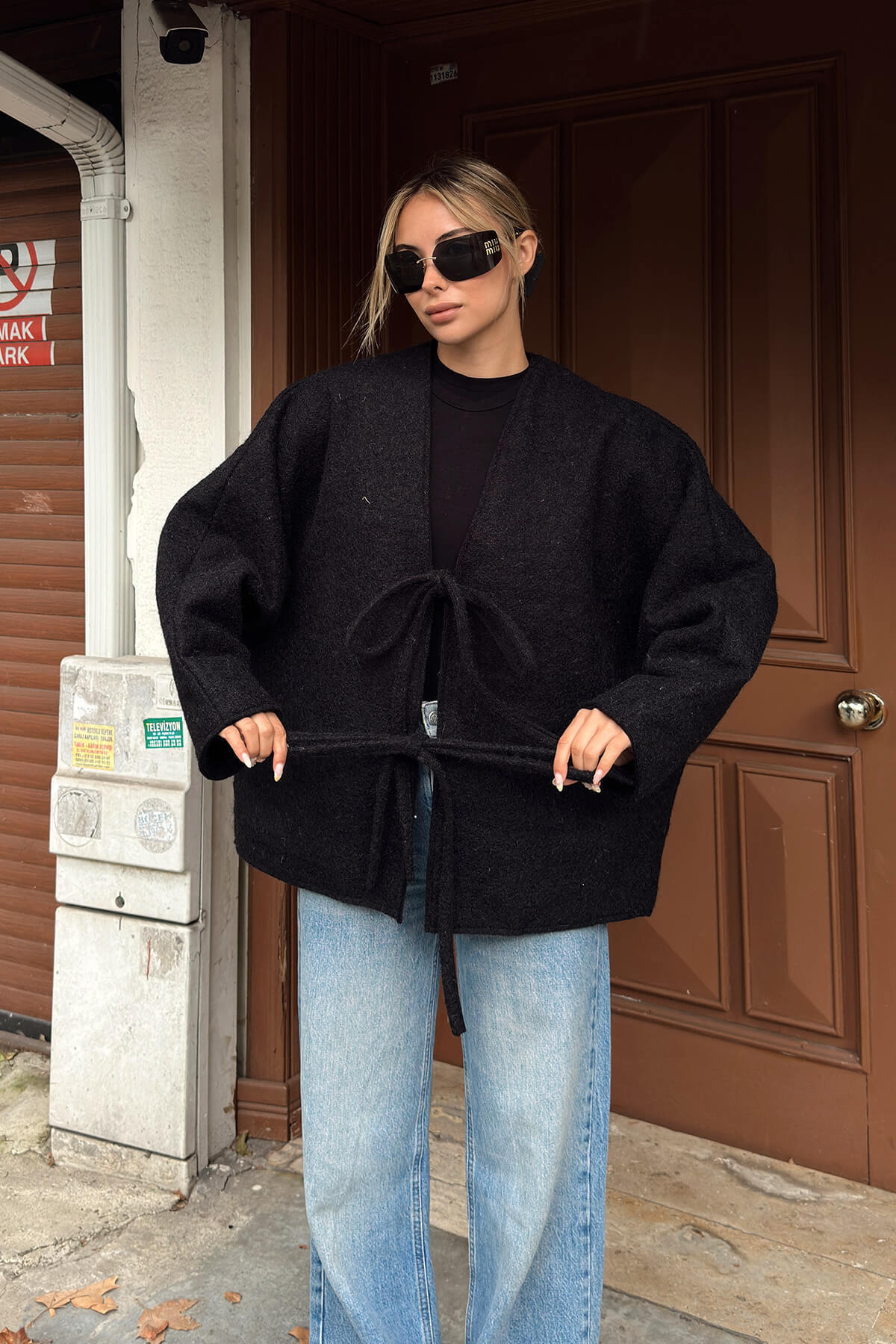 Siyah Oversize Bağlama Detaylı Kadın Yün Kaşe Ceket