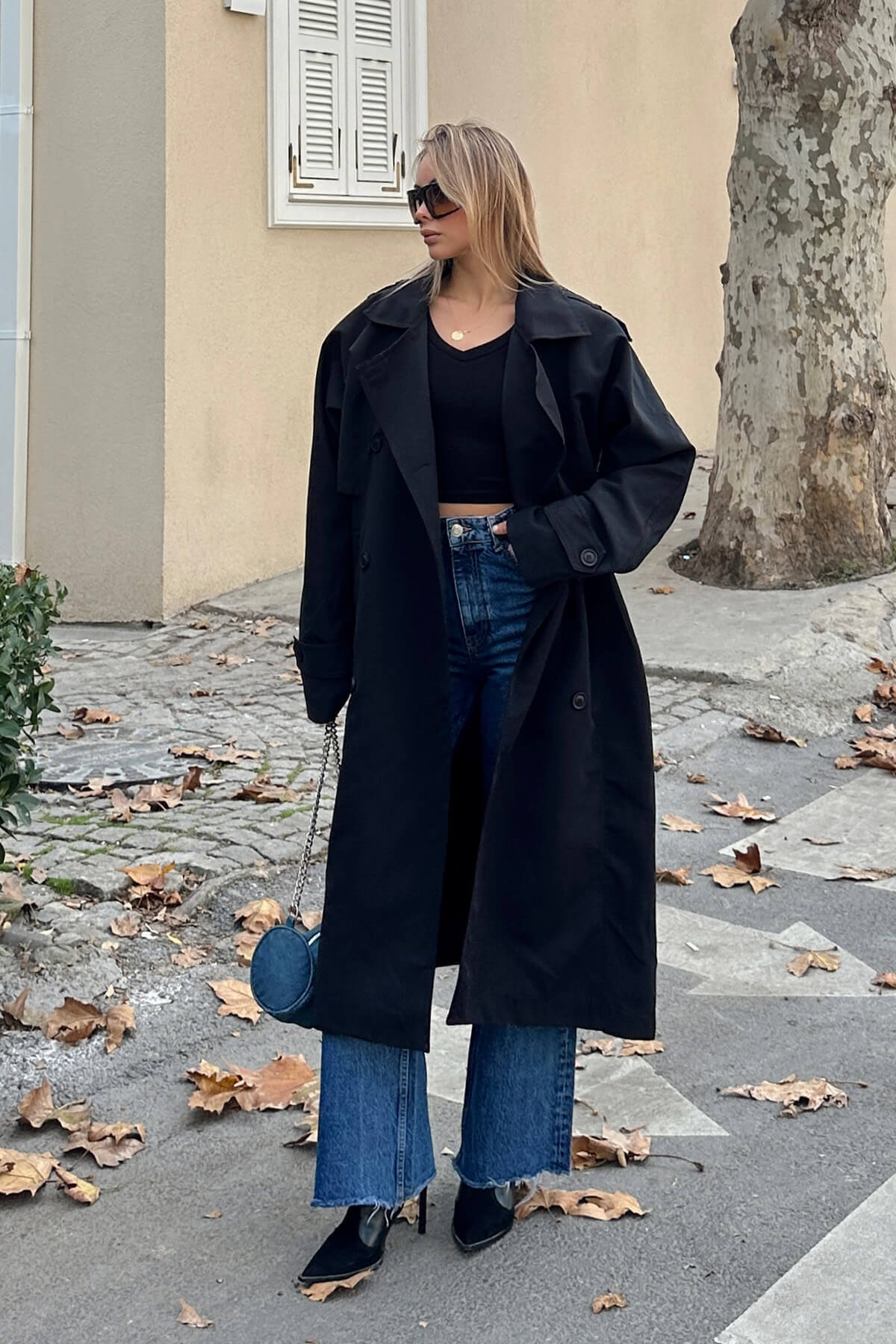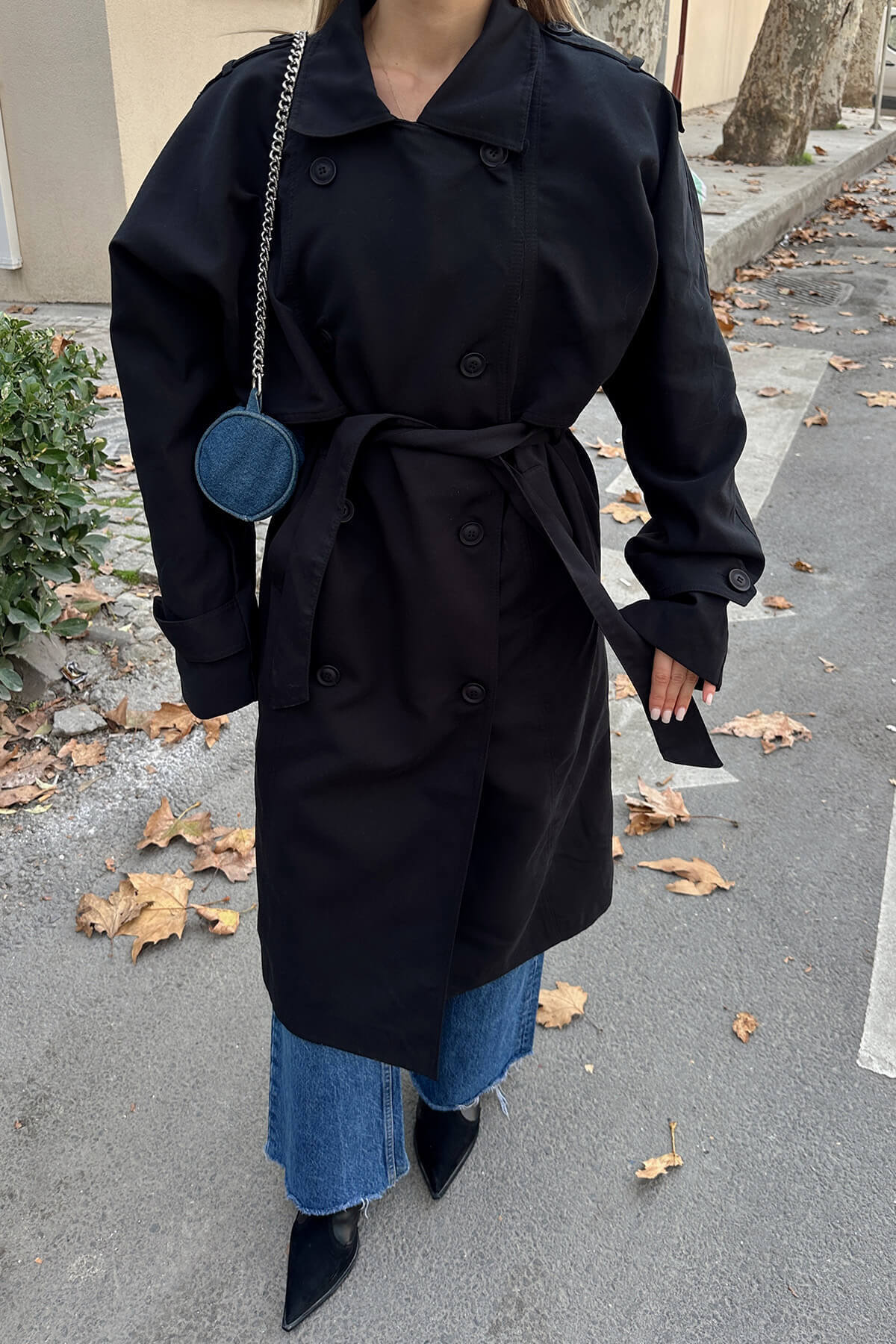 Siyah Oversize Kuşaklı Kruvaze Yaka Apoletli Kadın Midi Trençkot
