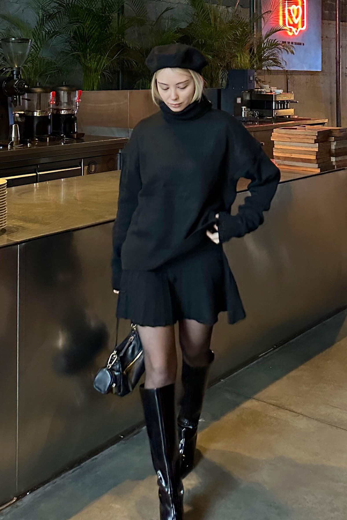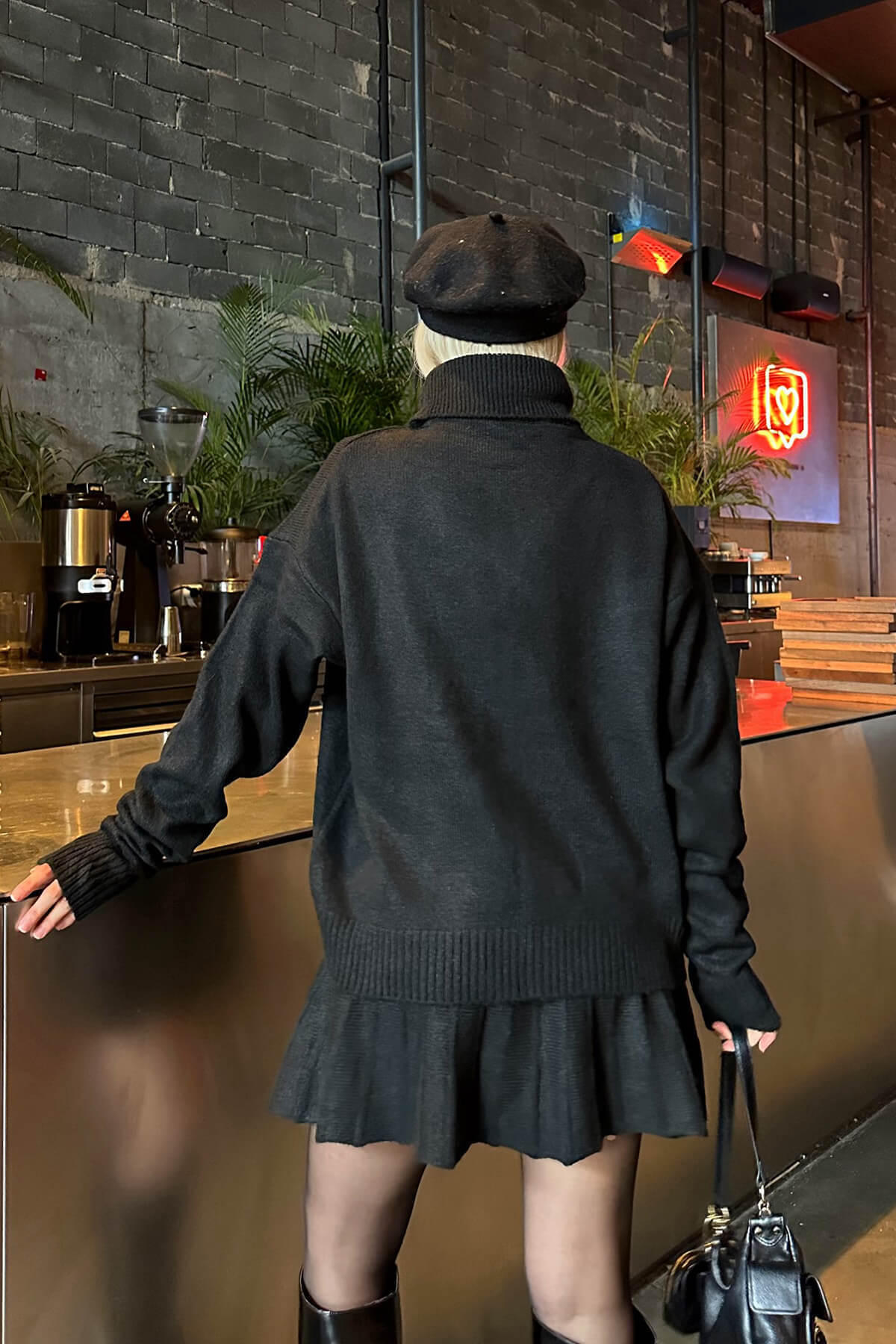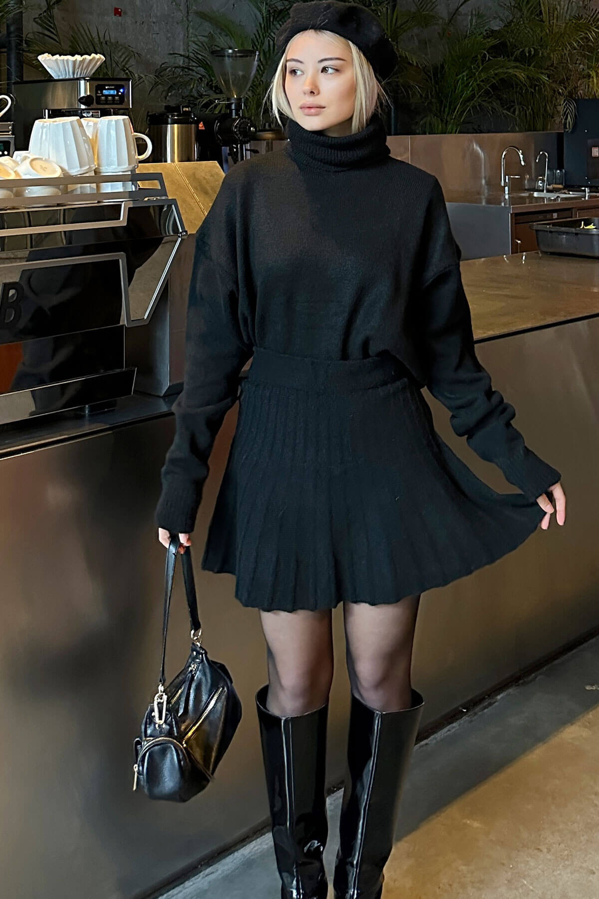 Siyah Raina Balıkçı Yaka Kazak-Pilise Etekli Kadın Triko Alt Üst Takım - 1