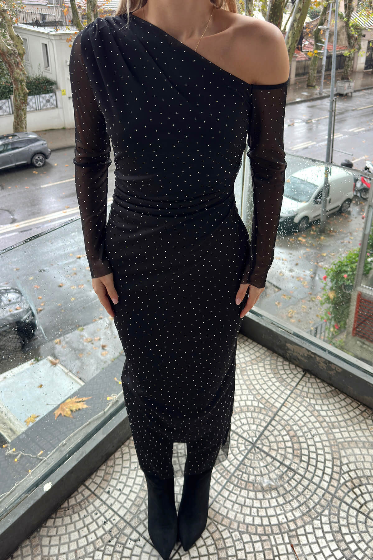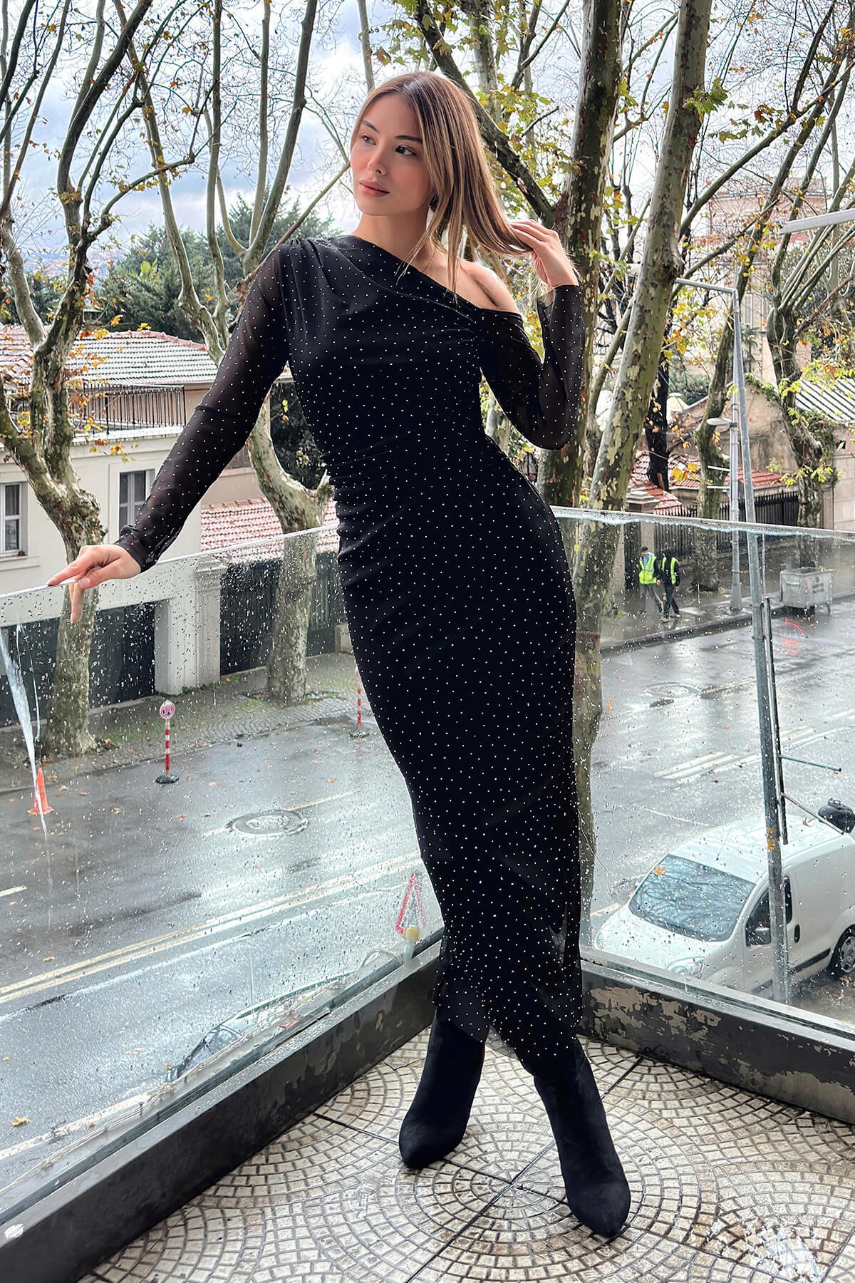 ek Omuz Drapeli Taş Detay Kadın Midi Tül Elbise, zarif tasarımı ve feminen detaylarıyla özel gün şıklığını ön plana çıkaran etkileyici bir parçadır. Tek omuz kesimi, elbiseye modern ve iddialı bir duruş kazandırırken omuz hattını estetik şekilde vurgular. Drapeli yapısı, vücut hatlarını yumuşak bir akışla sararak dengeli ve zarif bir siluet oluşturur. Tül kumaşın hafif ve akıcı dokusu, elbiseye romantik bir hava katarken midi boy kesimiyle sofistike bir görünüm sunar. Taş detaylar, tasarıma ışıltılı ve dikkat çekici bir dokunuş ekleyerek özel davetlerde öne çıkmanızı sağlar. Şık davetlerden kokteyl organizasyonlarına kadar farklı ortamlarda rahatlıkla tercih edilebilen bu kadın midi elbise, minimal aksesuarlarla tamamlandığında güçlü ve etkileyici bir stil ortaya koyar. Zamansız tasarımıyla sezon trendlerine uyum sağlayan bu elbise, zarafet arayan kadınların gardırobunda ayrıcalıklı bir yere sahip olur.