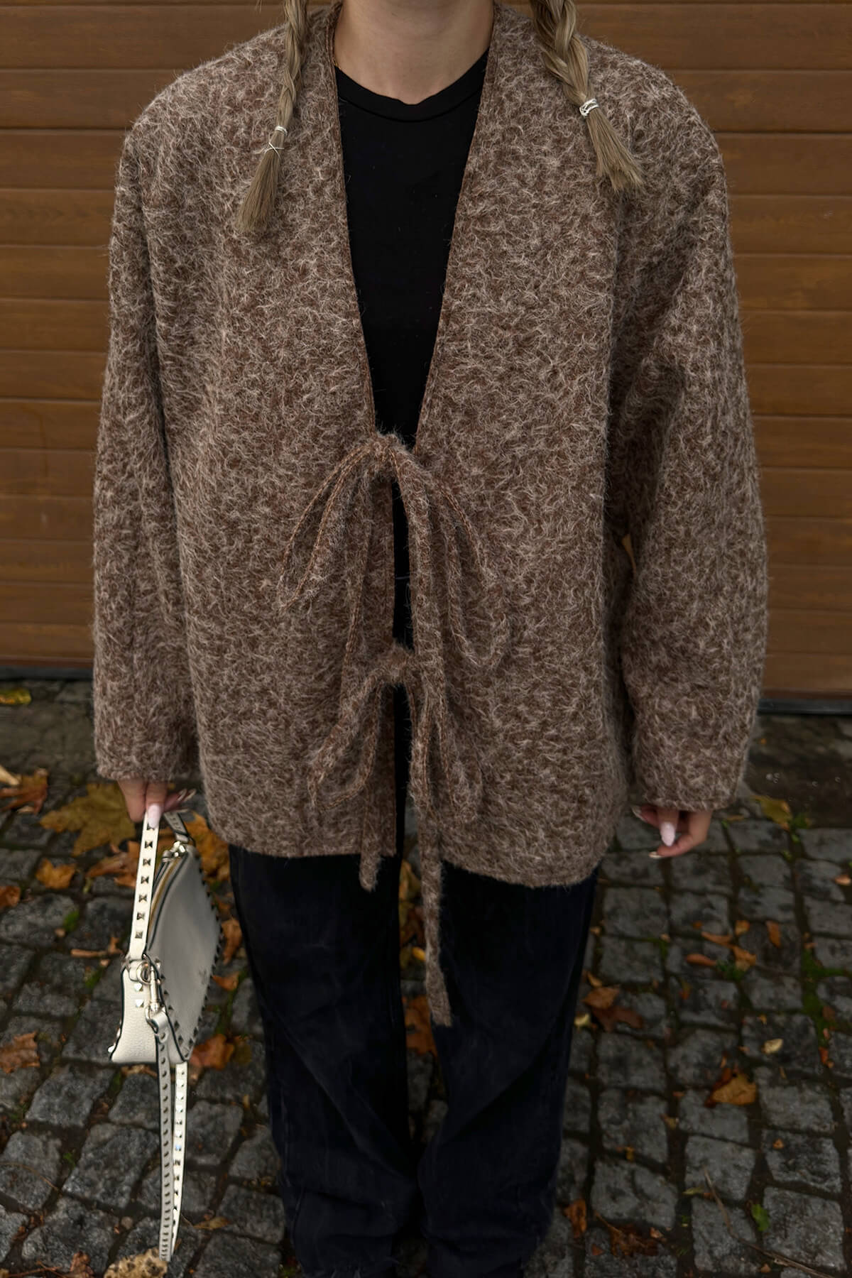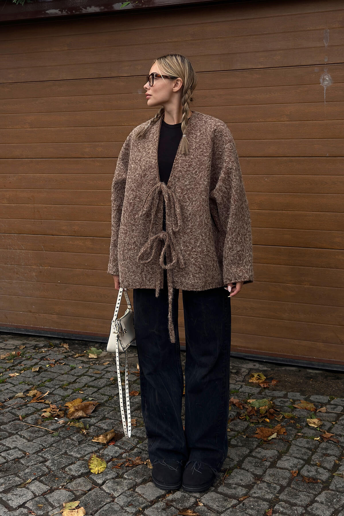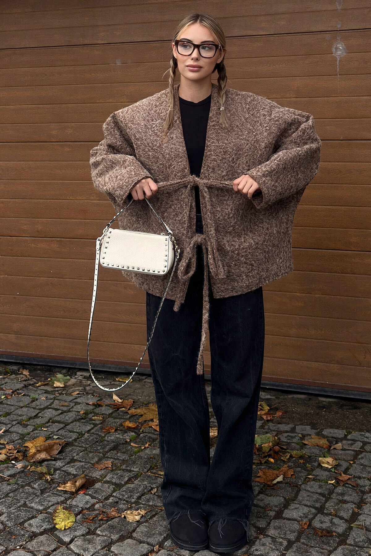 Vizon Oversize Bağlama Detaylı Kadın Yün Kaşe Ceket