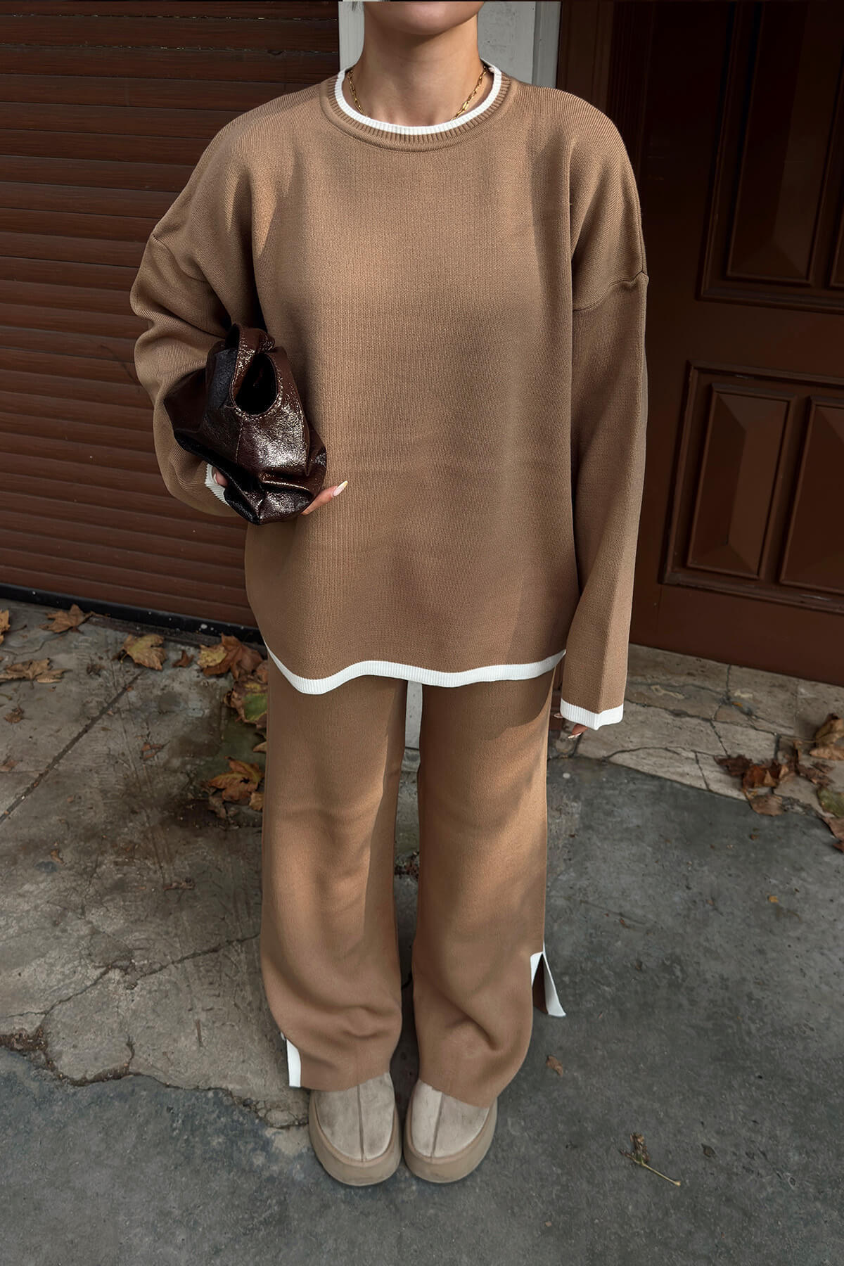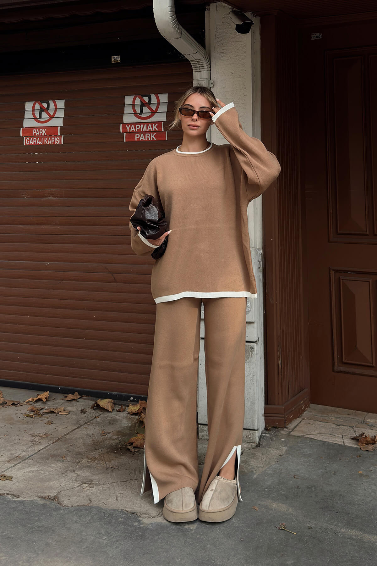 Vizon Uma İntersiye Çizgili Yırtmaçlı Oversize Kazak-Pantolon Kadın Triko Alt-Üst Takım - 1